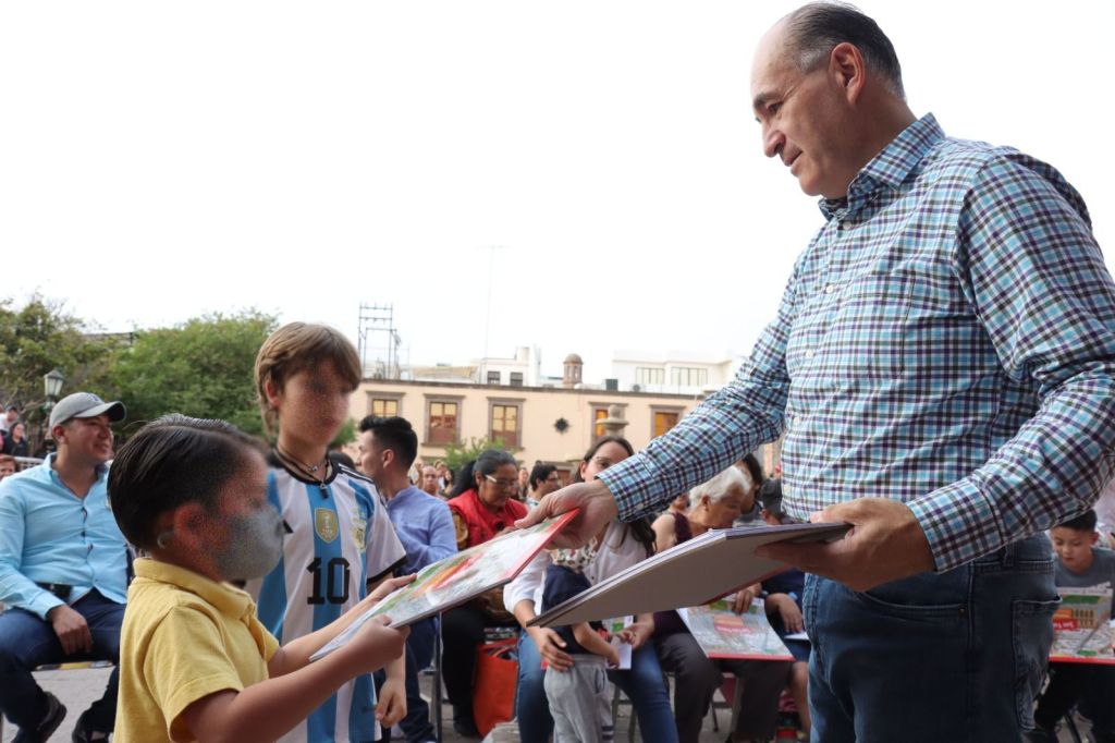 Previo a la puesta en escena de Lego Batman, el Presidente Municipal Capitalino Enrique Galindo Ceballos, entregó a las decenas de niños reunidos en la Plazoleta de Aranzazú libros para colorear, editados por la Dirección de Turismo Municipal y cuyas páginas contienen ilustraciones de los edificios, estatuas y monumentos más representativos de la Capital del Sí.
