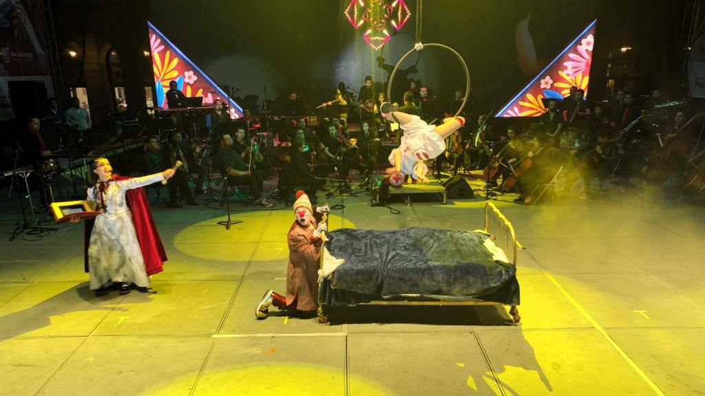 Este jueves, como espectáculo principal del Festival Internacional San Luis en Primavera, la ópera clown Santino, el Camino del Mago acaparó la atención del público asistente en la Plaza de los Fundadores, que siguieron miles de potosinos con gusto, pese a la lluvia que por momentos se presentó.