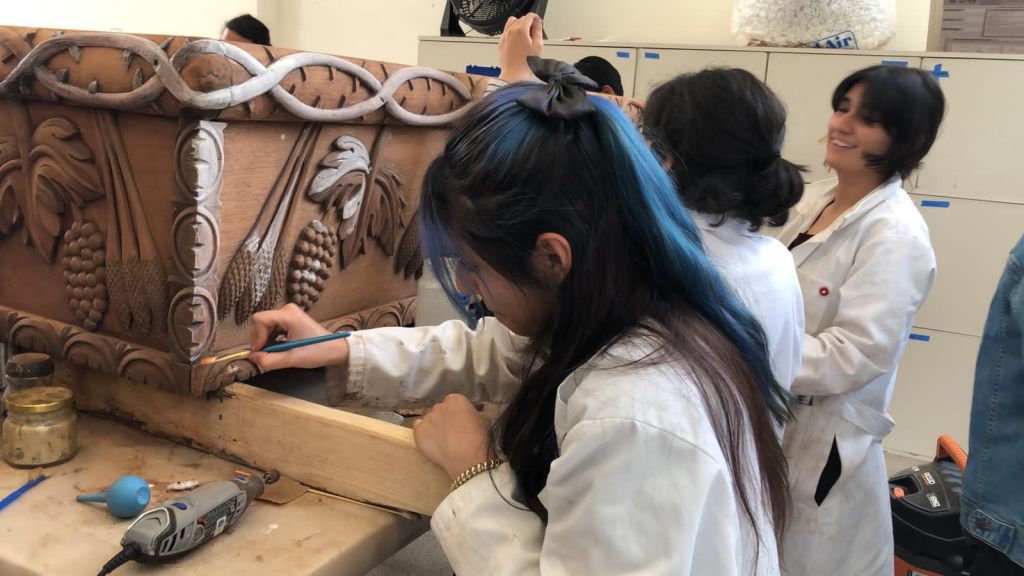 Alumnas y alumnos del Taller de Escultura que se imparte en la carrera de Conservación y Restauración de Bienes Culturales Muebles de la Facultad del Hábitat, y con la asesoría del Mtro. Rodrigo Esqueda López, catedrático de la misma licenciatura, realizaron los procesos de conservación del anda procesional.