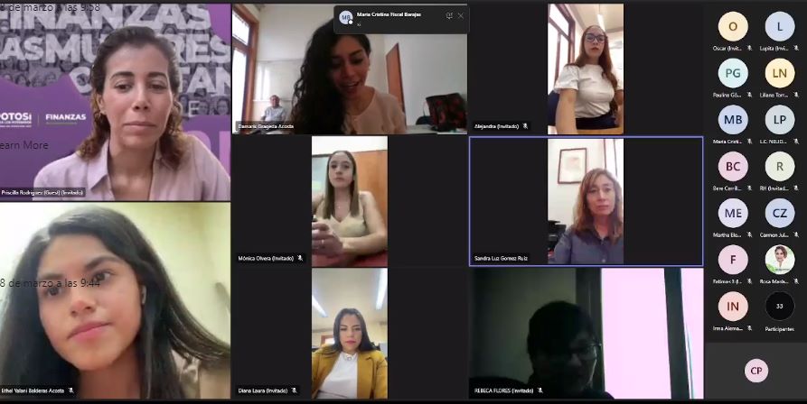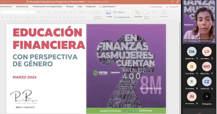 Como parte de las múltiples actividades que realizó el Gobierno del cambio que dirige Ricardo Gallardo Cardona, en el marco de la conmemoración del Día Internacional de la Mujer, la Secretaría de Finanzas (Sefin) a través de su Unidad para la Igualdad de Género, realizó la conferencia virtual “Educación Financiera con Perspectiva de Género”, impartida por Priscilla Victoria Rodríguez Quiroz, experta en temas financieros y presupuestales.