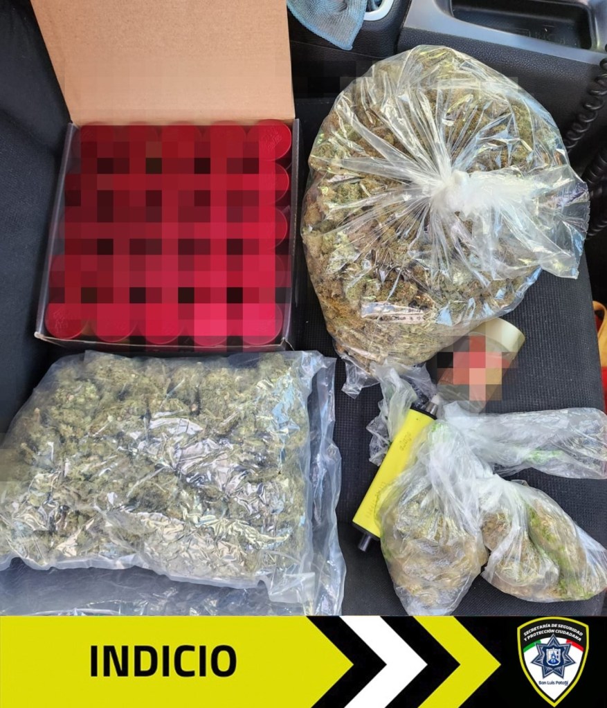 Durante la revisión preventiva, los oficiales detectaron dentro del vehículo varias bolsas y frascos de plástico en cuyo interior se encontraba una hierba verde con características a la marihuana, por lo que también el copiloto, de nombre Antonio “N” de 20 años, fue asegurado.