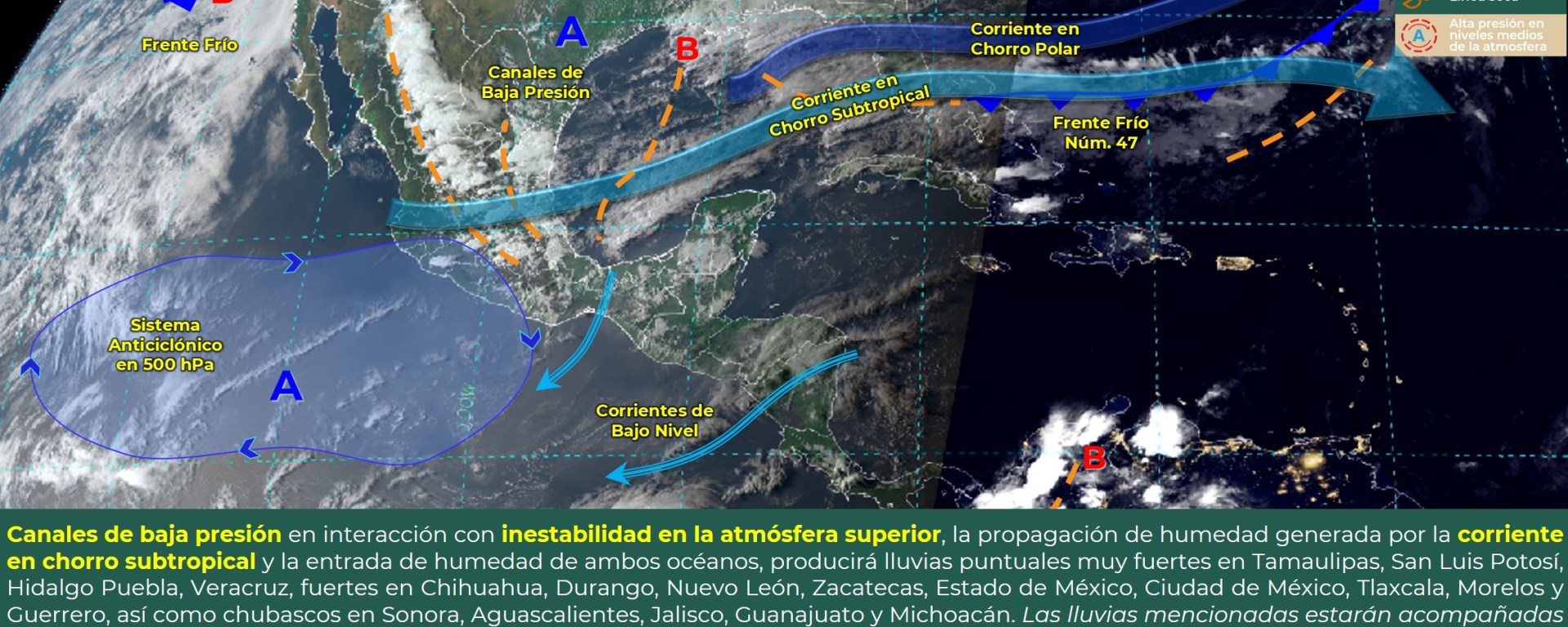 Viento con rachas de 40 a 60 km/h: Jalisco, Aguascalientes y Guanajuato; con posibles tolvaneras: Baja California Sur, Chihuahua, Coahuila, Nuevo León, Durango, Zacatecas y San Luis Potosí.