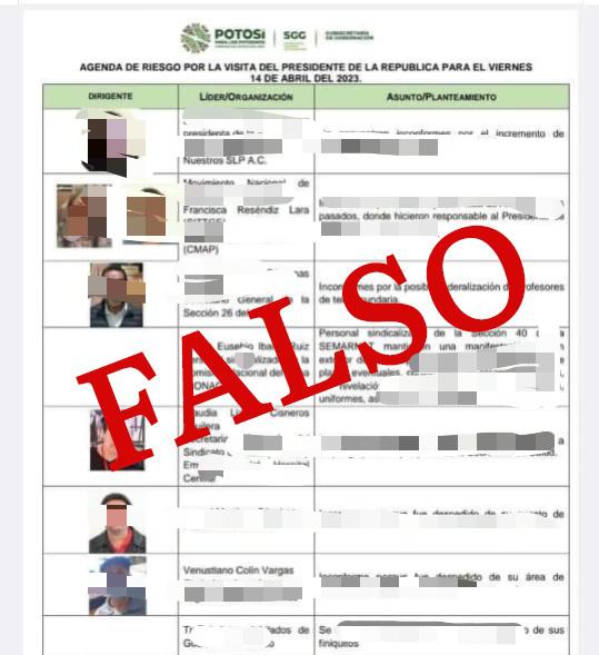 La Secretaría General de Gobierno (SGG), alerta a la población para que no se deje engañar por la difusión de una supuesta “agenda de riesgos” que presuntamente emitió esta dependencia y la subsecretaría de Gobernación, con motivo de la próxima visita del Presidente de México Andrés Manuel López Obrador a esta entidad; al respecto, la SGG desconoce el origen del documento que se difunde principalmente en redes sociales.