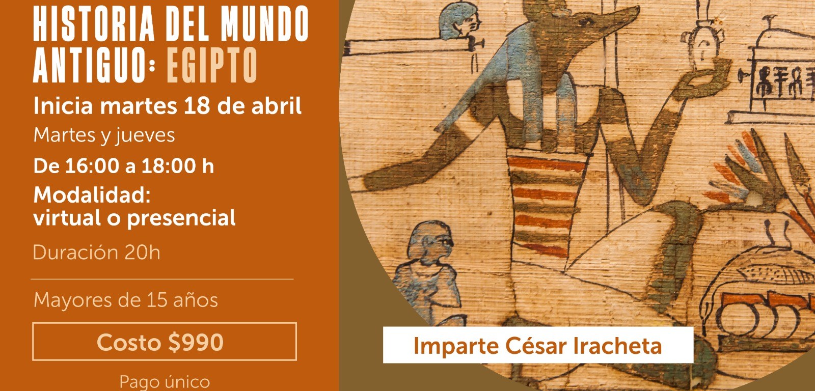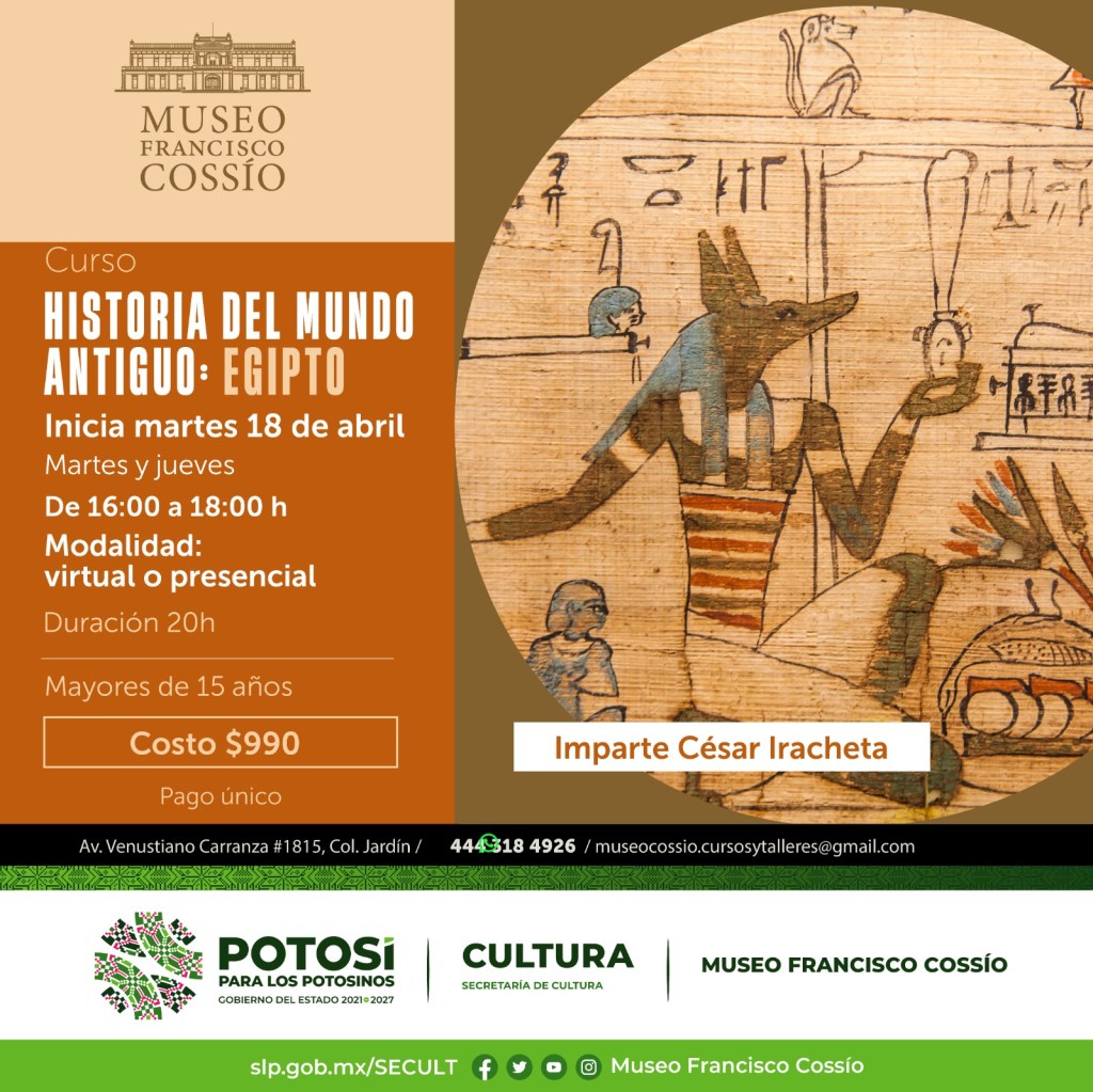 La Secretaría de Cultura de San Luis Potosí, invita al público mayor de 15 años al curso Historia del mundo antiguo: Egipto, que iniciará el próximo martes 18 de abril y que se estará realizando los martes y jueves de 16:00 a 18:00 horas, con una duración de 20 horas y tendrá un costo de $990.00.