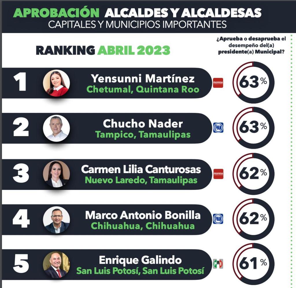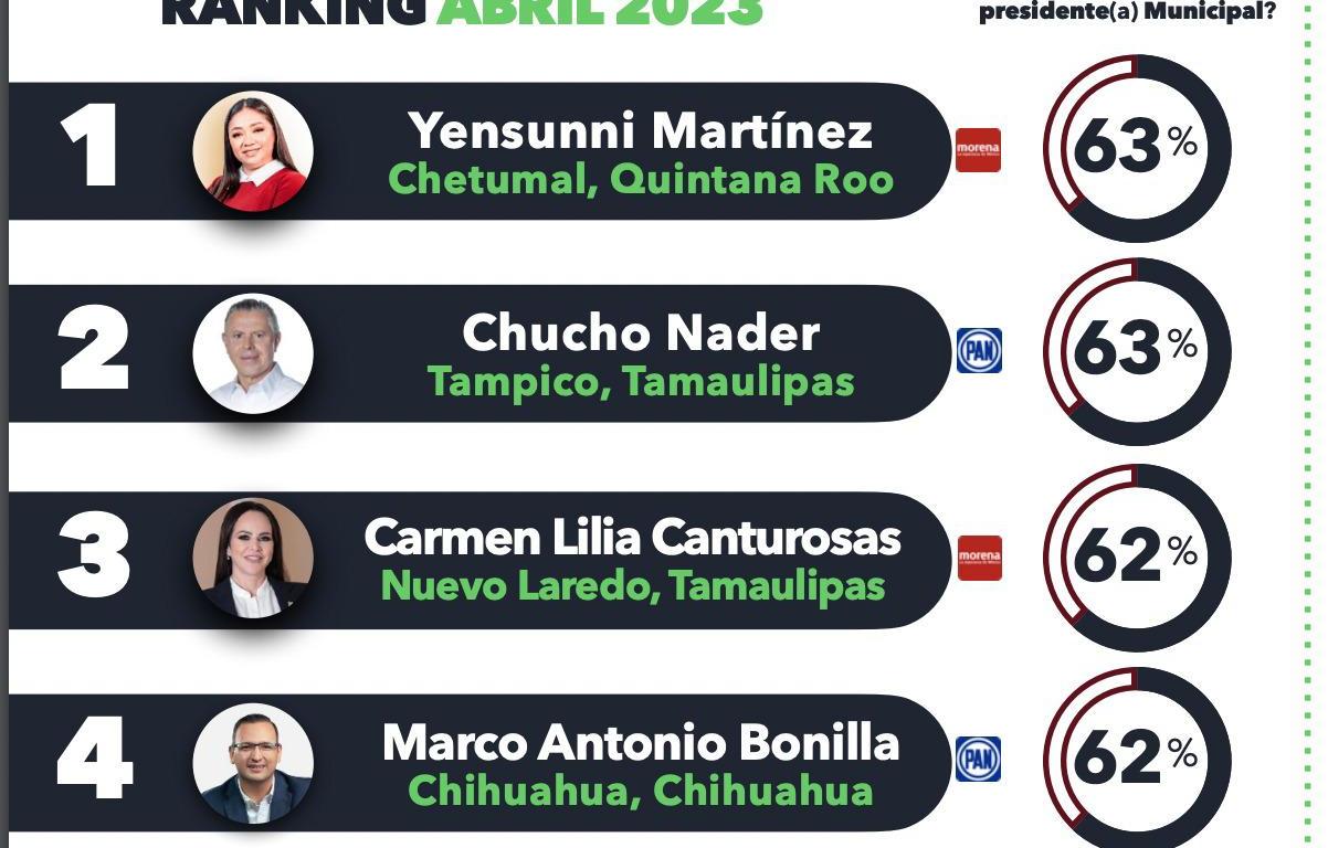 Los más altos porcentajes de aprobación fueron para la alcaldesa de Chetumal, Quintana Roo, Yensunni Martínez, con 63 por ciento; al igual que Jesús Nader, de Tampico, Tamaulipas; seguidos de Carmen Lilia Cantú Rosas, de Nuevo Laredo y de Marco Antonio Bonilla, de Chihuahua, Chihuahua, ambos con 62 puntos porcentuales.