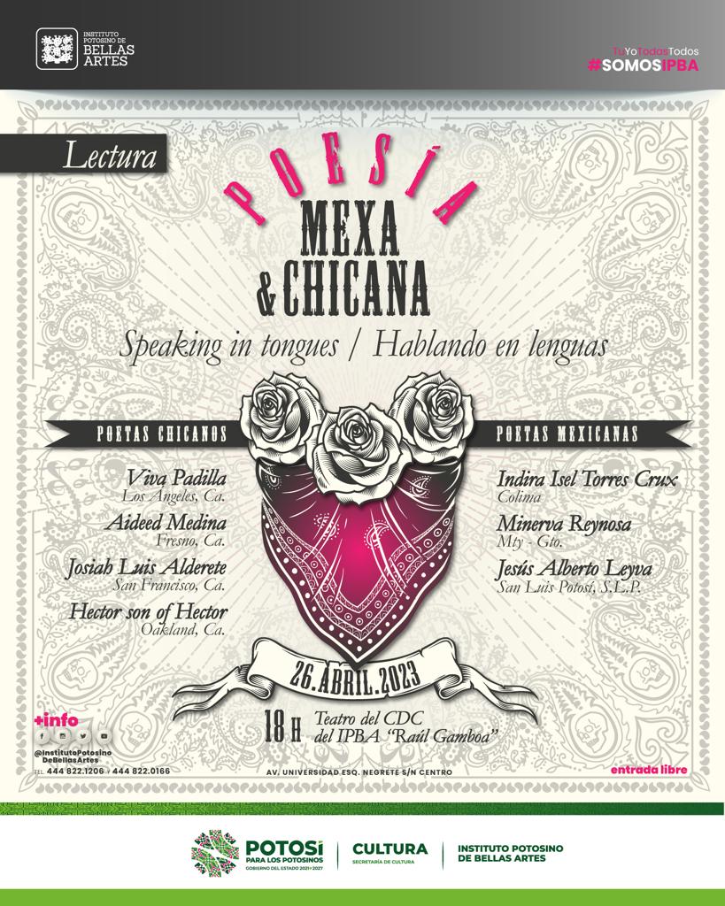 La Secretaría de Cultura de San Luis Potosí invita a la Lectura de poesía Mexa & Chicana “Speaking in tongues / Hablando en lenguas.”, evento gratuito que se llevará a cabo el próximo miércoles 26 de abril, a las 18:00 horas, en el Teatro del Centro de Difusión Cultural “Raúl Gamboa” del Instituto Potosino de Bellas Artes, ubicado en Av. Universidad esq. Negrete sn Centro, frente a la Alameda Juan Sarabia.