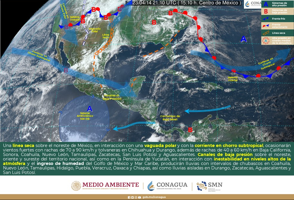Cielo medio nublado a nublado la mayor parte del día, con chubascos acompañados de descargas eléctricas y posible caída de granizo en San Luis Potosí y lluvias aisladas Nuevo León. Ambiente frío a muy frío por la mañana, con heladas en sierras de Chihuahua, Durango y Zacatecas. Por la tarde, ambiente caluroso en la región. Viento del oeste y noroeste de 20 a 30 km/h con rachas de 50 a 70 km/h y tolvaneras en Chihuahua, Coahuila y Nuevo León, y de hasta 50 km/h en el resto de la región.