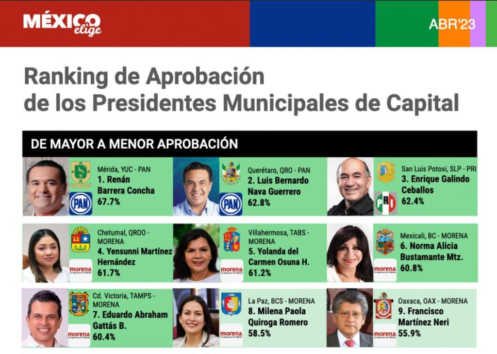 Los resultados que presentó México Elige colocan en primer lugar al Presidente Municipal de Mérida, Yucatán, Renán Barrera Concha, con 67.7 puntos porcentuales; mientras que en segundo lugar aparece Luis Bernardo Nava, de Querétaro, con 62.8 por ciento de aprobación.