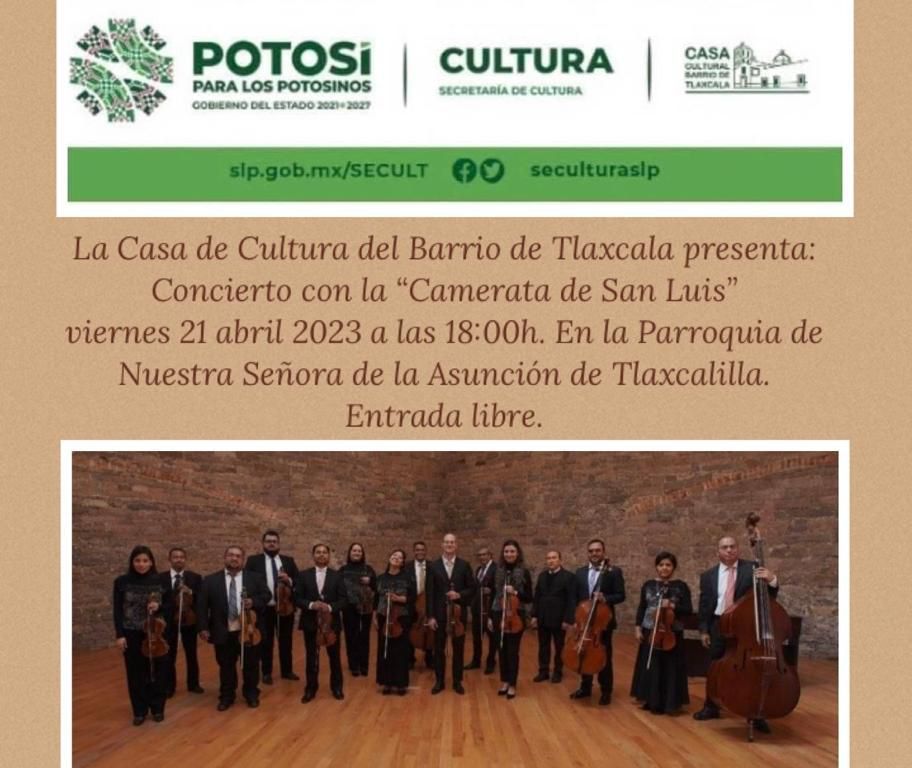 La Secretaría de Cultura de San Luis Potosí, invita al público en general a disfrutar de los conciertos que durante el mes de abril ofrecerá la Camerata de San Luis, el primero de ellos en la parroquia de nuestra señora de la Asunción de Tlaxcalilla, el viernes 21 de abril a 18:00 horas, con entrada libre.