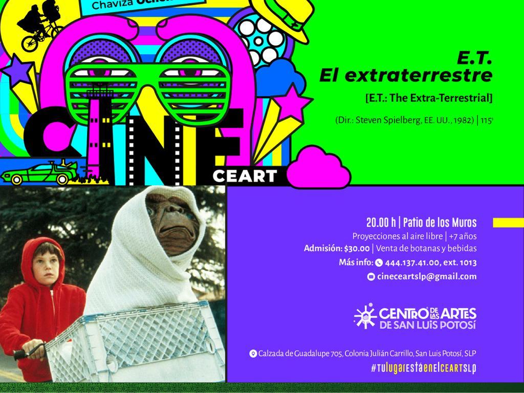 La Secretaría de Cultura de San Luis Potosí, invita a disfrutar del nuevo ciclo de Cine Ceart “Chaviza Ochentera”, que se llevará a cabo en el Patio de los Muros del Centro de las Artes SLP este viernes 21 de abril a las 20:00 horas, con la proyección de la cinta “E.T.“ (1982), del director Steven Spielberg.