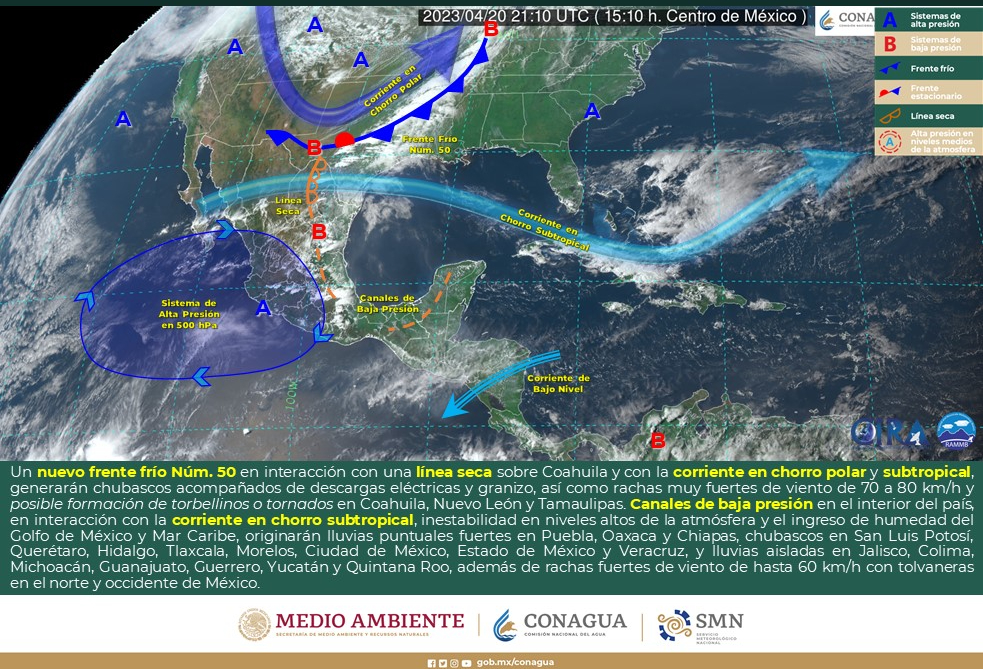 Viento con rachas de 40 a 60 km/h con posibles tolvaneras: Sonora, Chihuahua, Coahuila, Durango, Zacatecas, San Luis Potosí, Aguascalientes, Nayarit, Jalisco, Michoacán, Guerrero, Guanajuato, Querétaro, Hidalgo, Estado de México, Ciudad de México y Puebla.