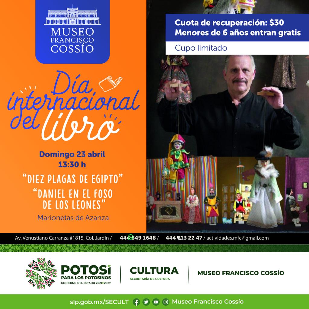 La Secretaría de Cultura de San Luis Potosí invita al público en general a las actividades que se estarán desarrollando en el Museo Francisco Cossío, en el marco del Día Internacional del Libro, tanto este viernes 21 como el domingo 23 de abril.