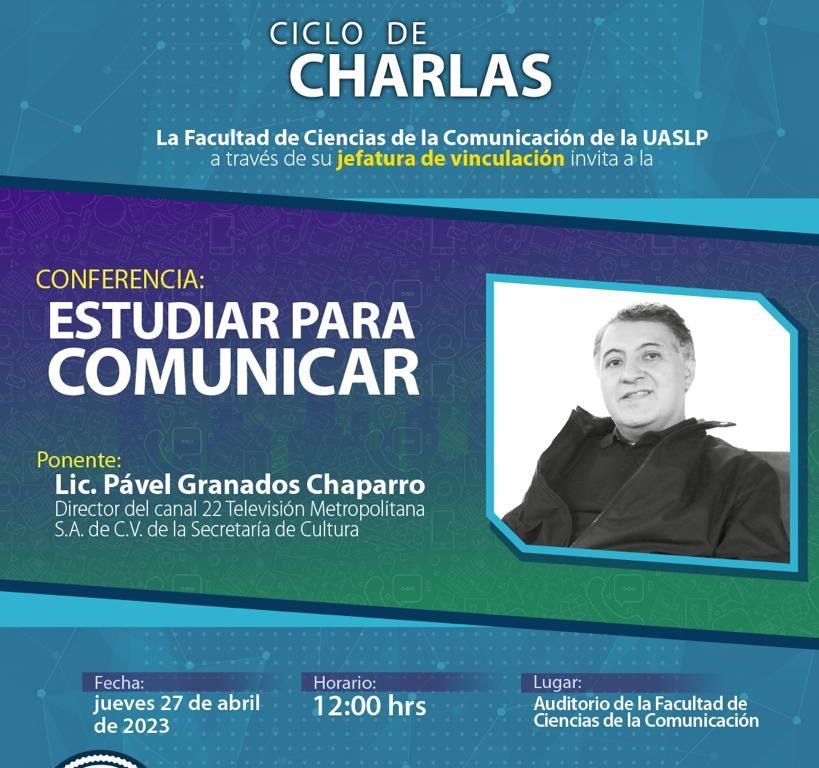 Dentro del ciclo de charlas de la Facultad de Ciencias de la Comunicación de la Universidad Autónoma de San Luis Potosí, se impartirá la conferencia “Estudiar para comunicar” a cargo del licenciado Pavel Granados Chaparro, director del canal 22 de Televisión Metropolitana, este jueves 27 de abril a las 12:00 horas, en el Auditorio del plantel.