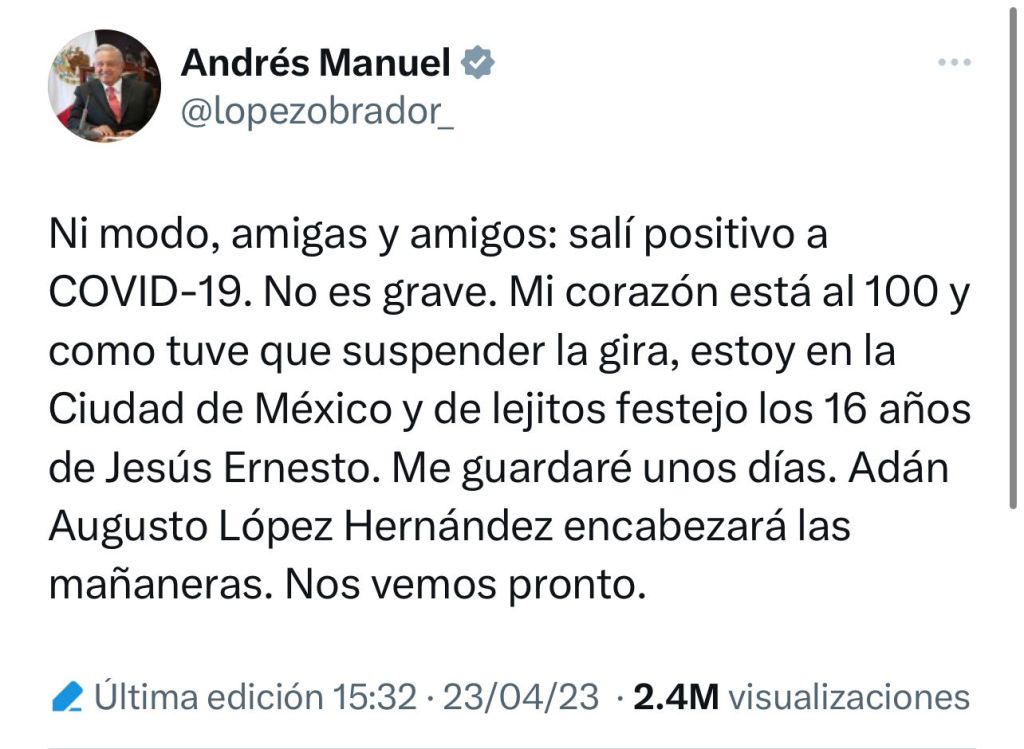 En su tuit, López Obrador descartó que haya padecido hoy alguna afección cardíaca y corroboró que ya se encuentra en la Ciudad de México, donde se aislará tras dar positivo a Covid-19.