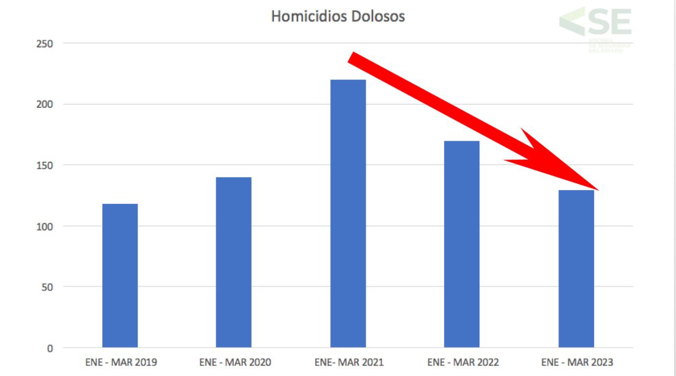 Durante los últimos años de la herencia maldita, el delito de homicidio doloso registró un aumento del 86 por ciento, mientras que desde el inicio de la actual administración hasta el primer trimestre del 2023, hay una reducción en un 41 por ciento.