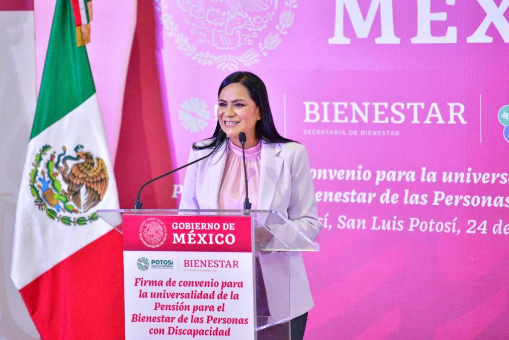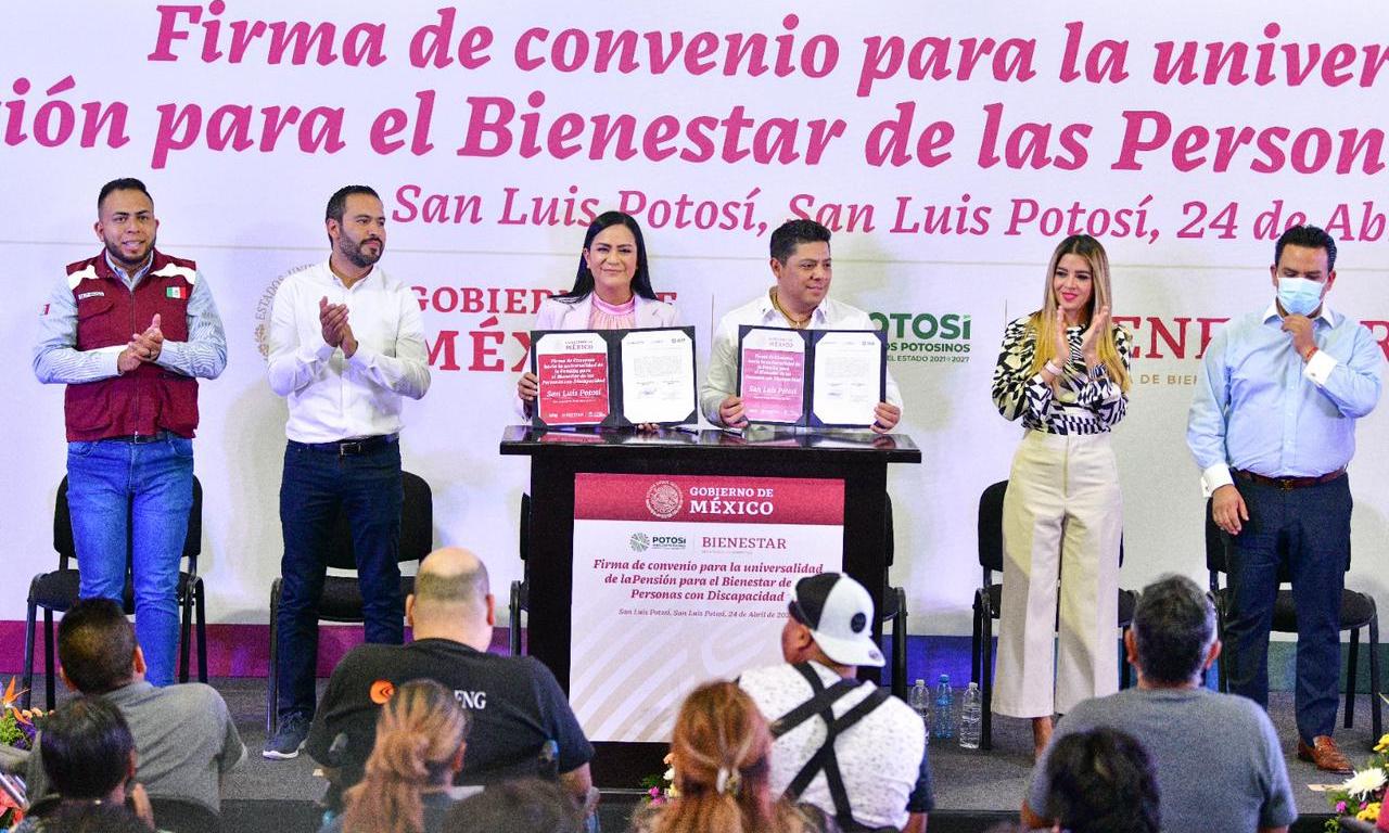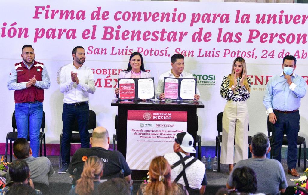 En cumplimiento a un compromiso más en beneficio de la población más vulnerable, el Gobernador de San Luis Potosí, Ricardo Gallardo Cardona, y la titular de la Secretaría del Bienestar Federal, Ariadna Montiel Reyes, concretaron la firma de convenio que suma al Estado a la Universalidad de la Pensión para el Bienestar de las Personas con Discapacidad, con un fondo inicial de 100 millones de pesos.