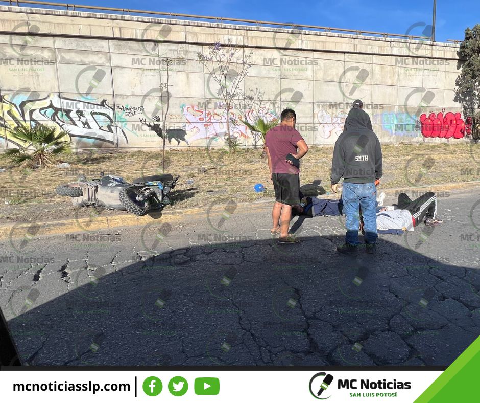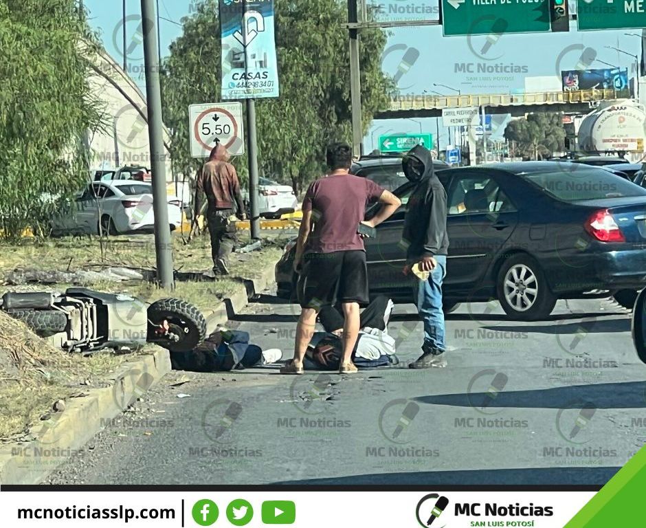 Accidente en la lateral de la Carretera 57 antes de llegar a Pozos, motociclista y acompañante accidentados tirados en la calle, al parecer algún vehículo los arrollo de su motocicleta.