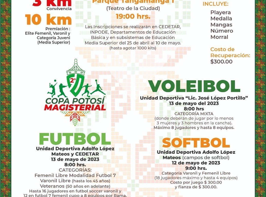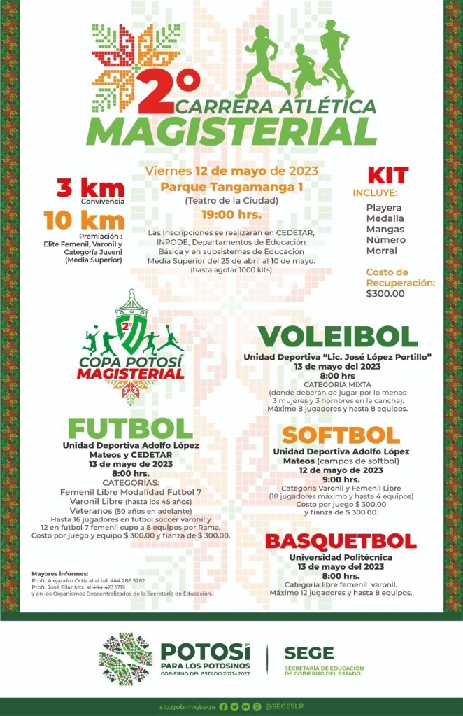 En este año, la carrera atlética se realizará el viernes 12 de mayo en el parque Tangamanga I, a las 19:00 horas, con inicio frente al Teatro Carlos Amador, en las categorías convivencia de tres kilómetros y 10 kilómetros femenil, varonil y juvenil; mientras que el viernes 12 y sábado 13 de mayo se llevará a cabo la Copa Potosí Magisterial en Futbol, Basquetbol, Voleibol y Softbol, en las Unidades Deportivas Adolfo López Mateos y José López Portillo, el Centro de Desarrollo de Talentos y Alto Rendimiento Deportivo “Plan de San Luis” y la Universidad Politécnica.