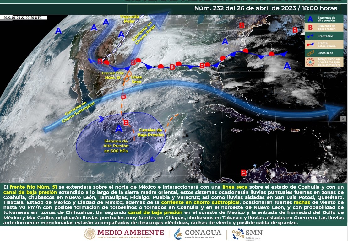Para mañana, el frente frío núm. 51 se localizará sobre el noreste del país, interaccionará con un canal de baja presión que se establecerá sobre el oriente de México y con la corriente en chorro subtropical, propiciarán lluvias y chubascos en el noreste, oriente y centro del país, siendo lluvias puntuales fuertes en Nuevo León, Tamaulipas, San Luis Potosí, Puebla y Veracruz. Por otra parte, otro canal de baja presión en el sureste de México y la entrada de humedad del Golfo de México y Mar Caribe, originarán chubascos en dicha región y lluvias puntuales fuertes en Chiapas. Las lluvias anteriormente mencionadas estarán acompañadas de descargas eléctricas, rachas fuertes de viento y posible caída de granizo. Finalmente, se mantendrá el ambiente caluroso a muy caluroso en los estados del litoral del Pacífico Mexicano, el sureste del país y la Península de Yucatán, con temperaturas máximas superiores a 40 °C en zonas de Jalisco, Colima, Michoacán, Guerrero, Oaxaca, Chiapas, San Luis Potosí, Veracruz, Tabasco, Campeche y Yucatán.