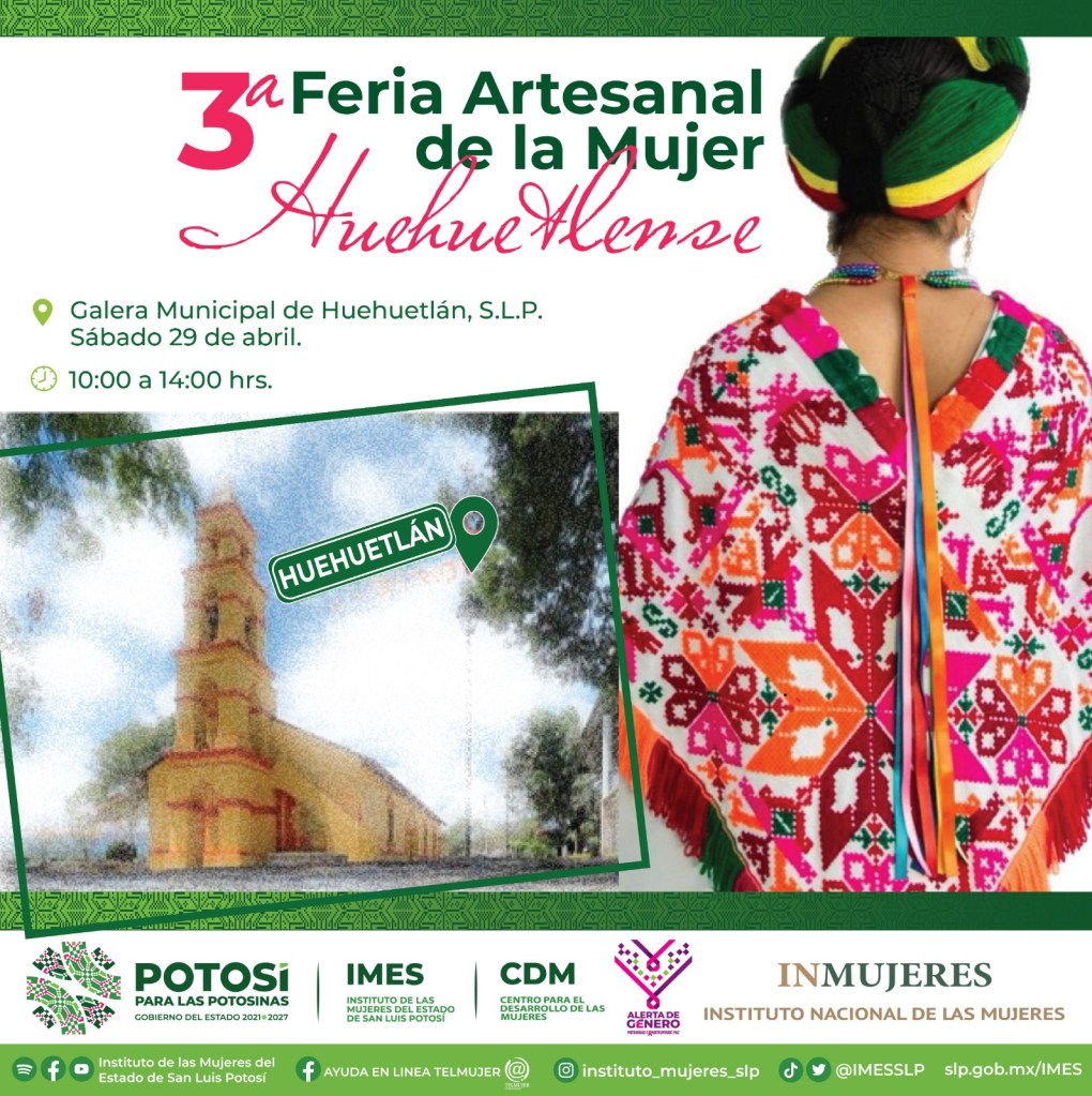 Como parte de la estrategia que promueve el Gobernador de San Luis Potosí, Ricardo Gallardo Cardona, de impulsar el empoderamiento económico de las potosinas, el Instituto de las Mujeres del Estado (Imes), a través del Centro para el Desarrollo de las Mujeres (CDM) de Huehuetlán, efectuarán la tercera Feria Artesanal Huehuetlense este sábado 29 de abril, donde participarán 12 jefas de familia.