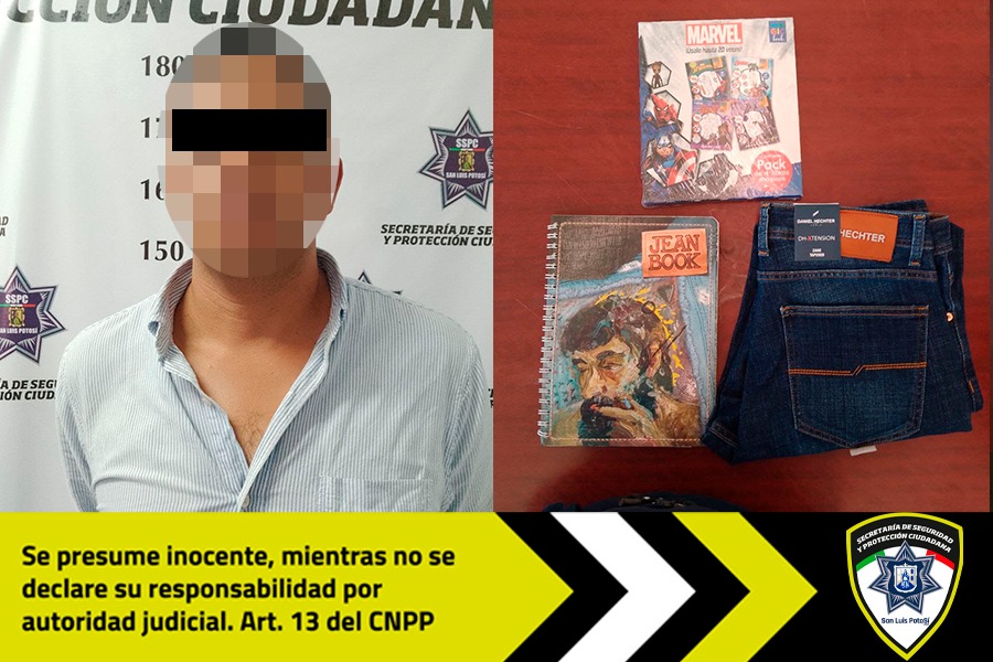 Al llegar ubicaron al presunto, el cual intentó salir con una libreta que utilizó para esconder un pantalón de mezclilla de la marca Hechter, además de portar un libro de colorear oculto en la cintura. Personal de seguridad del comercio confirmó que el sujeto había salido por línea de cajas sin pagar los artículos, por lo que era su deseo proceder legalmente.