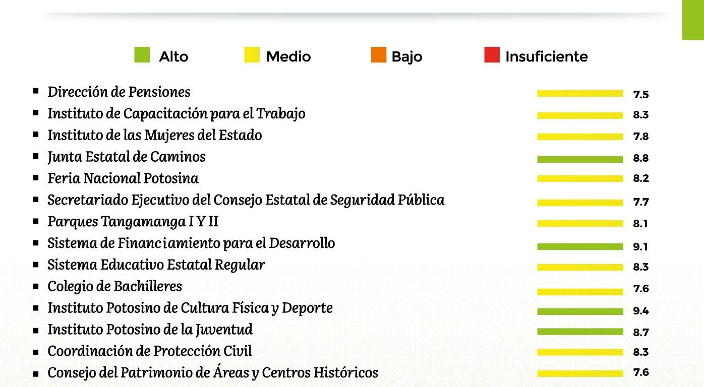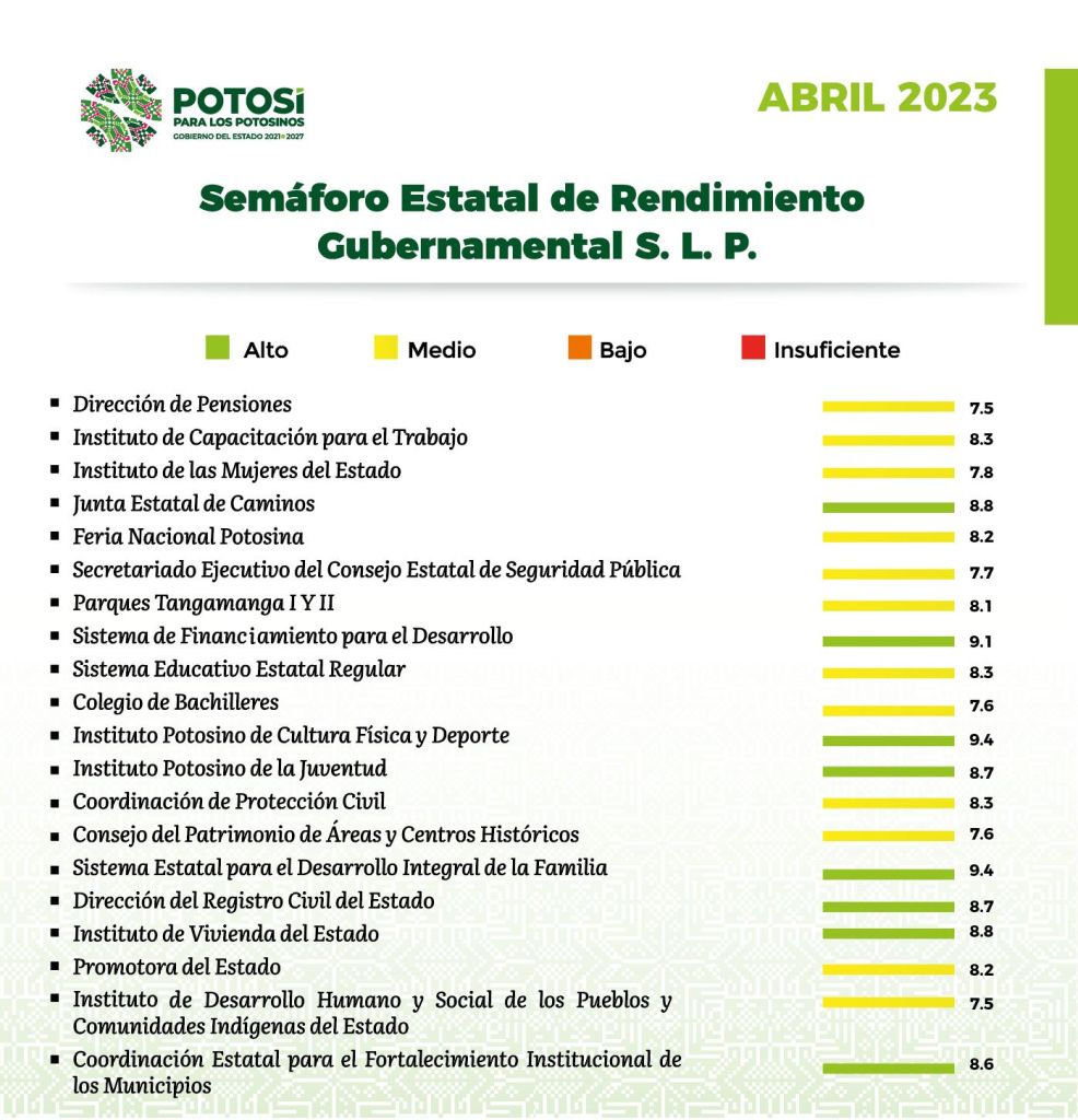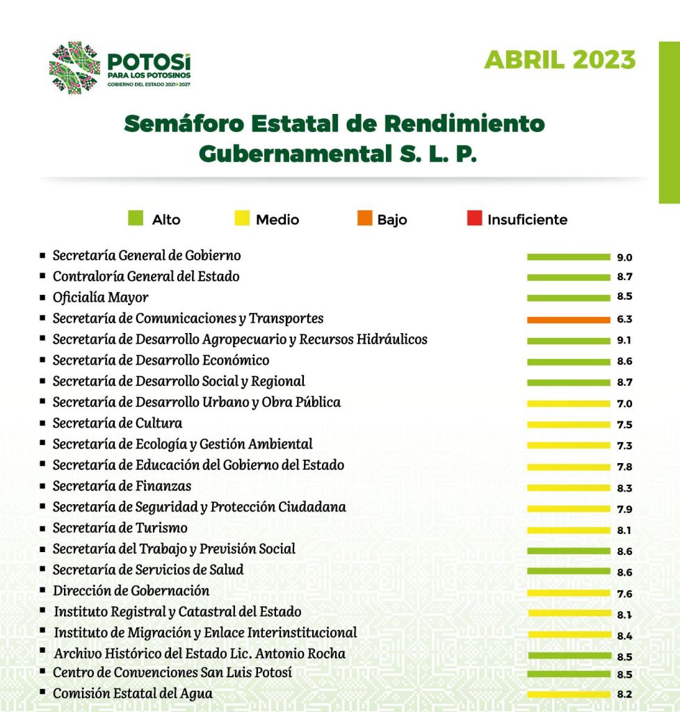 Gallardo Cardona recordó que el semáforo cuenta con cuatro valoraciones: alto, medio, bajo e insuficiente, que sirven para evaluar el actuar de las y los funcionarios estatales, mediante los parámetros de atención ciudadana, que incluye el seguimiento a las solicitudes hechas al Gobernador; el cumplimiento al Plan Estatal de Desarrollo 2021-2027 en sus objetivos y metas; la comunicación externa como la generación de información, eventos, manejo de redes sociales y atención a medios y un apartado de gobernabilidad, donde se observa la relación interinstitucional.