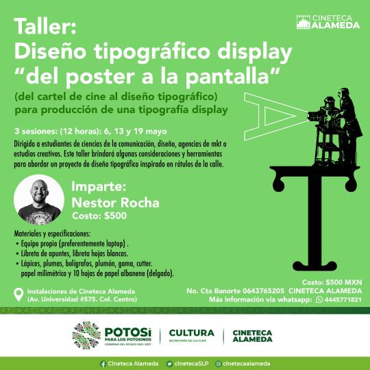 La Secretaría de Cultura de San Luis Potosí, invita al público interesado a participar en el taller de “Diseño tipográfico display: del poster a la pantalla” que impartirá Néstor Rocha en la Cineteca Alameda los días sábado 06 y 13 de mayo de 10:00 a 14:00 horas, y viernes 19 de mayo de 16:00 a 20:00 horas.