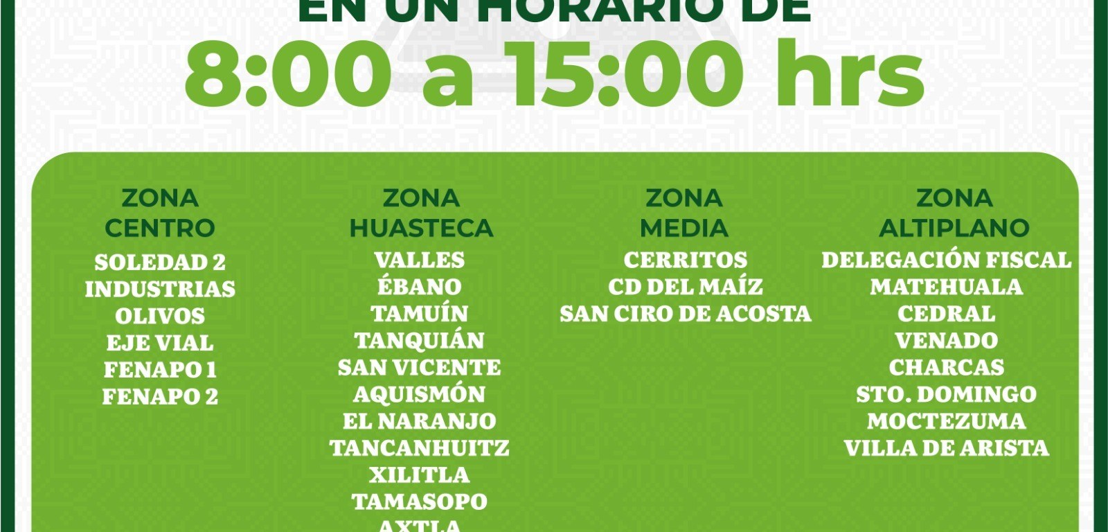 El secretario de Finanzas detalló que en la zona metropolitana permanecerán abiertas las oficinas Soledad 2, Industrias, Olivos, Fenapo 1 y Fenapo 2, módulo de la Secretaría de Seguridad Pública. En la zona Huasteca, operarán las de Ciudad Valles, Ébano, Tamuín, Tanquián, San Vicente, Aquismón, El Naranjo, Tancanhuitz, Xilitla, Tamasopo y Axtla. En la región Media, se atenderá en Ciudad del Maíz, Cerritos y San Ciro de Acosta. Mientras que en el Altiplano, abrirán los módulos de Matehuala, Cedral, Venado, Charcas, Moctezuma, Santo Domingo y Villa de Arista.