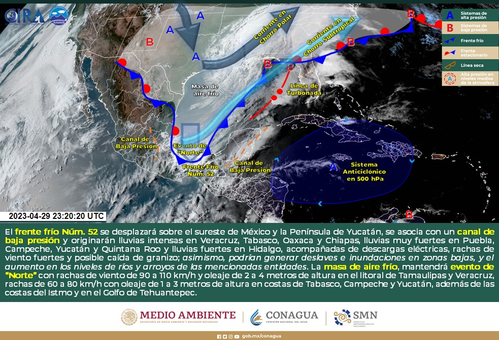 Viento de componente norte con rachas de 60 a 80 km/h: Istmo y Golfo de Tehuantepec; con rachas de 40 a 60 km/h: costas de Campeche y Yucatán, disminuyendo gradualmente durante la tarde.