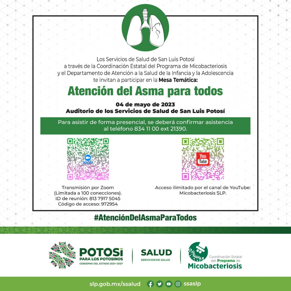 Hernández Torres, anunció que a través del Programa de Micobacteriosis y el Departamento de Atención a la Salud de la Infancia y la Adolescencia el próximo 4 de mayo, se realizará una mesa temática con expertos donde, tocarán temas sobre la situación epidemiológica del asma en San Luis Potosí, el diagnóstico y tratamiento, importancia de las pruebas diagnósticas y los retos para la atención en la infancia todo en el contexto de esta enfermedad, para asistir de forma presencial se deberá confirmar asistencia al teléfono 4448341100 extensión 21390, o a través de Zoom y canal de YouTube, Micobacteriosis SLP.
