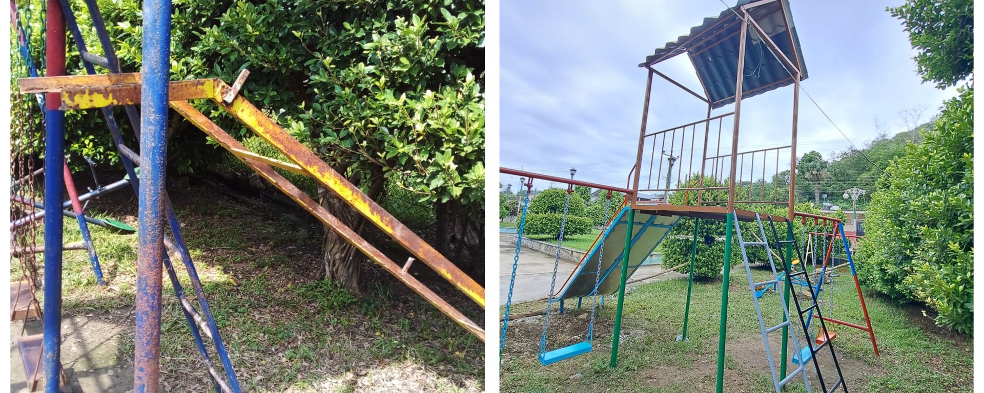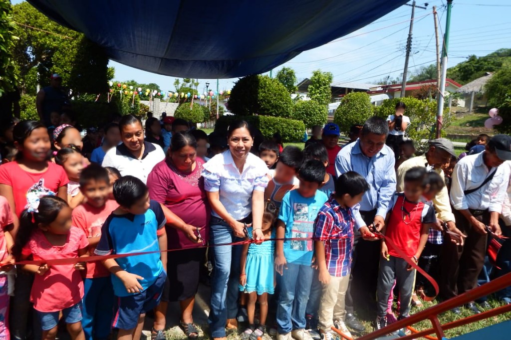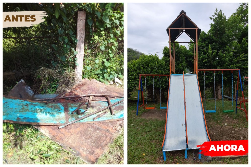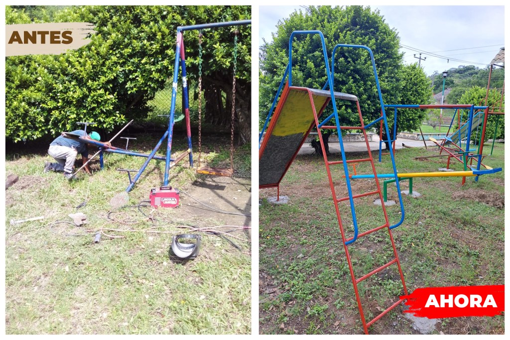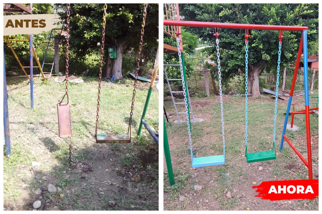 Finalmente, a mediados del mes de abril, iniciaron los trabajos de restauración, donde se cambió el mobiliario viejo y oxidado, por juegos nuevos, de mejor calidad, para que las y los pequeños de la comunidad de Escuatitla, puedan tener un momento de dispersión y disfrutar de los juegos al aire libre.