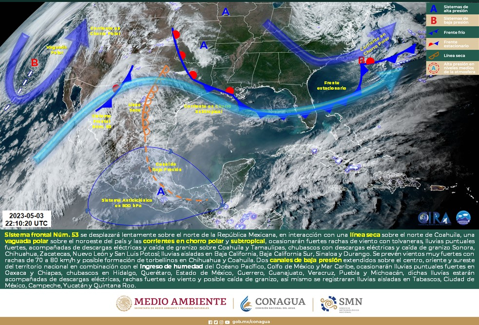 Viento de componente sur con rachas de 40 a 60 km/h y posibles tolvaneras: Baja California Sur, Zacatecas, Aguascalientes, San Luis Potosí y Jalisco.