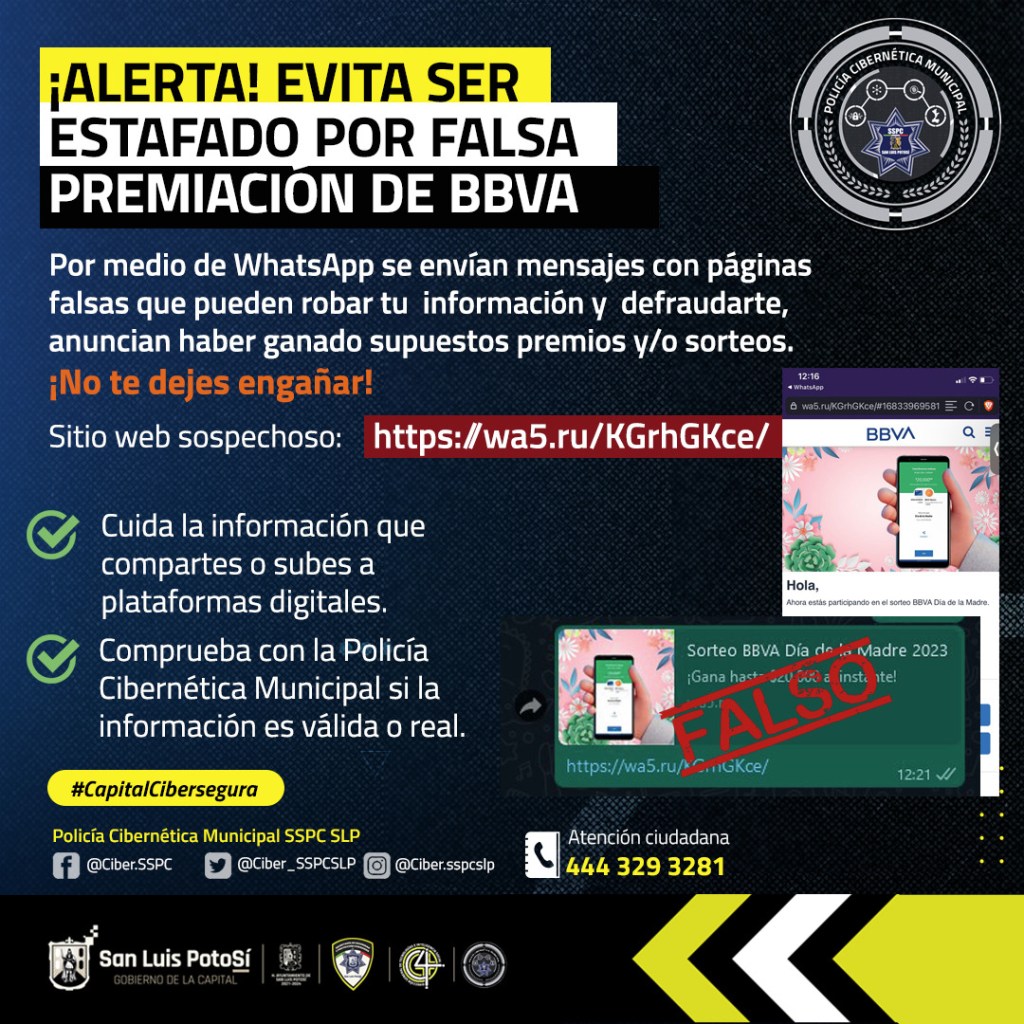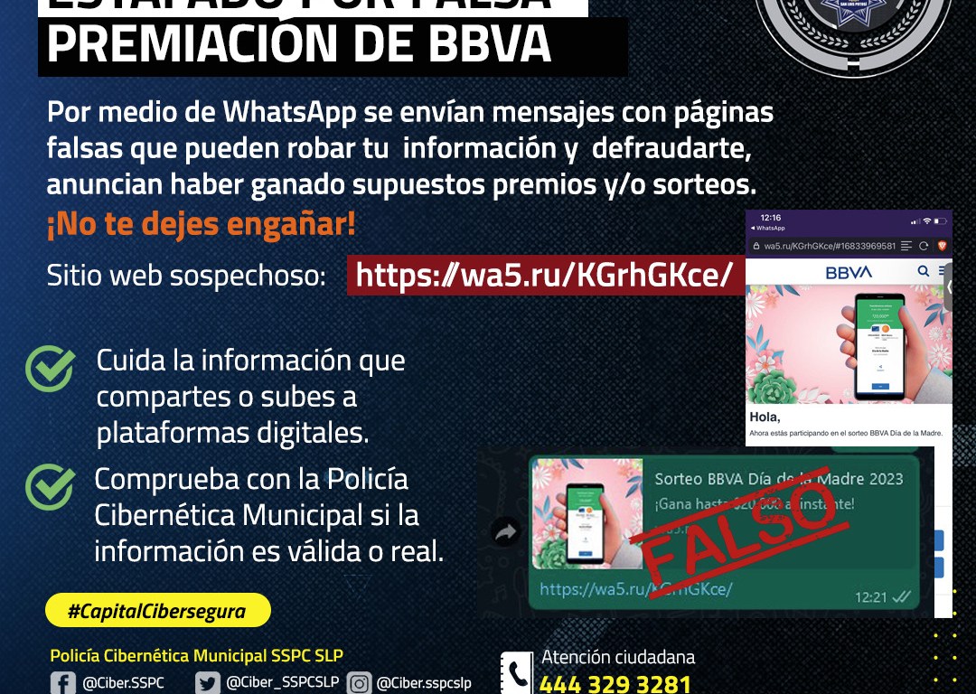 A través del trabajo de inteligencia social, se logró la identificación de un mensaje de WhatsApp que contiene la leyenda «Regalo del Día de la Madre por BBVA», proveniente de una URL maliciosa. La Policía Cibernética Municipal alerta a la población a evitar caer en este tipo de engaños y estafas.