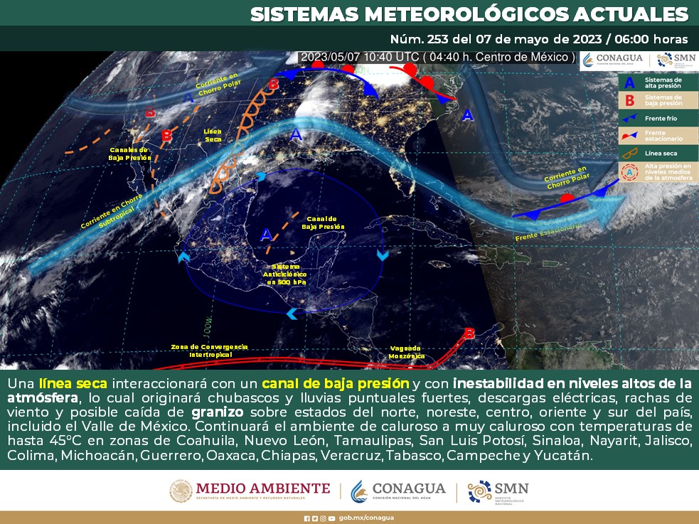 Viento con rachas de 40 a 60 km/h y posibles tolvaneras: Baja California, Baja California Sur, Sonora, Sinaloa, San Luis Potosí, Tabasco, Campeche y Yucatán.