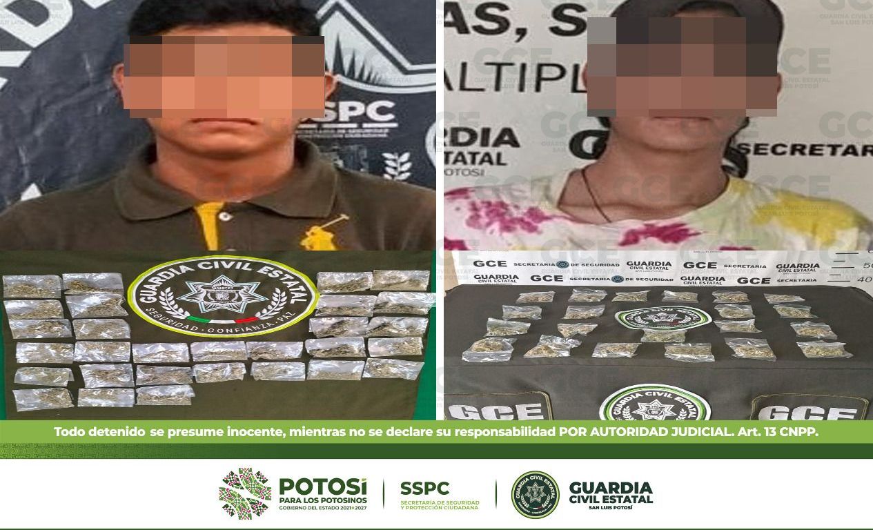 Derivado de los trabajos de inteligencia que son realizados en los 58 municipios de la Entidad potosina por oficiales de la Guardia Civil Estatal (GCE), dos hombres fueron detenidos en la región Huasteca y Altiplano por presunta posesión de narcóticos cantidades considerables.