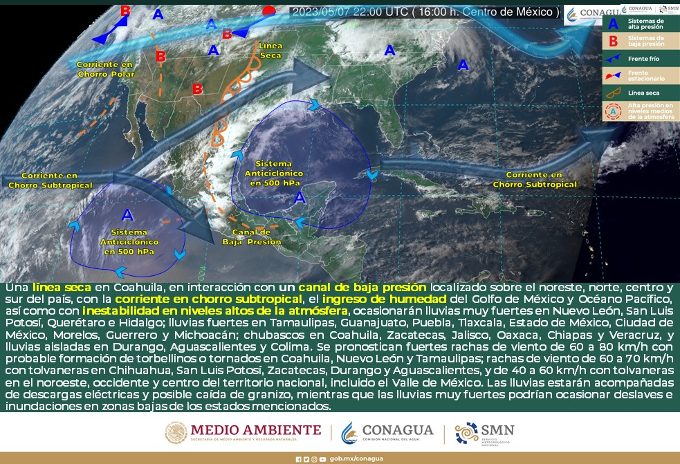 Viento con rachas de 60 a 80 km/h y tolvaneras: Chihuahua, Nuevo León, Tamaulipas, Durango, Zacatecas, San Luis Potosí y Aguascalientes.