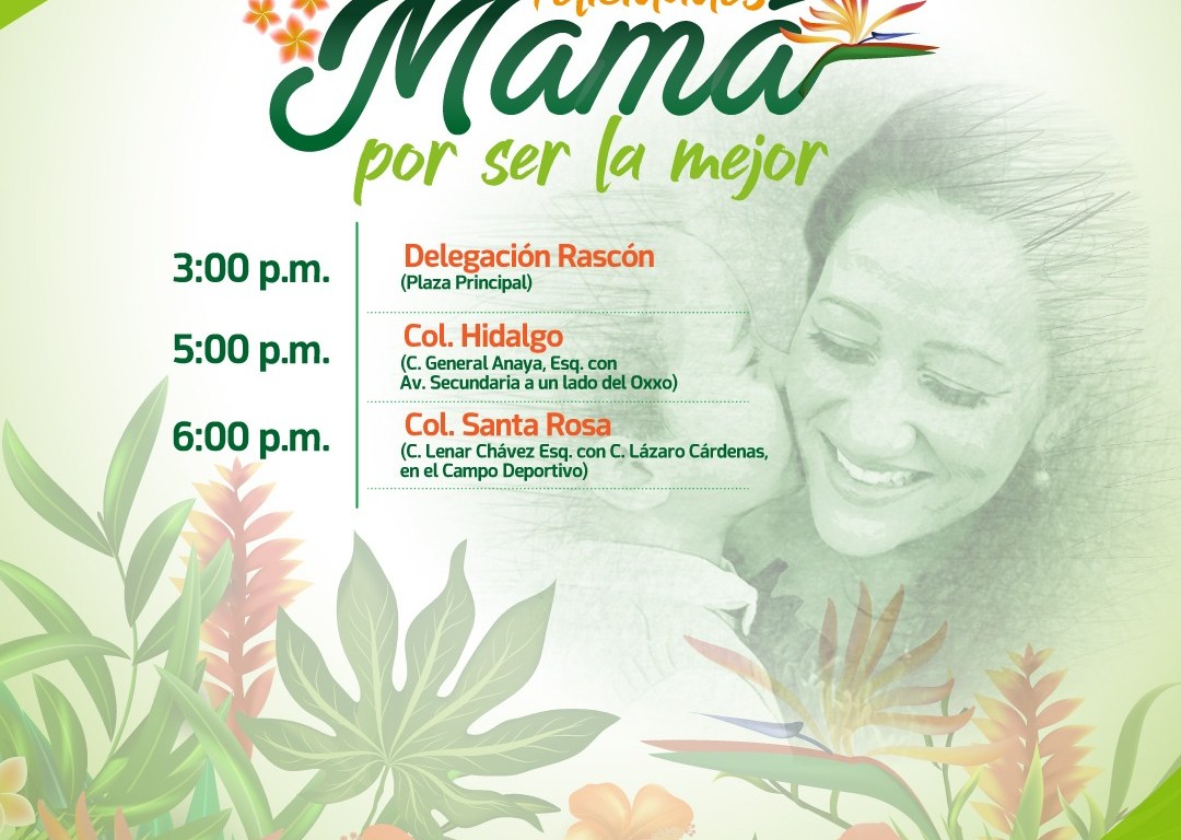 Indicó que serán cinco días de festejos, iniciándose este martes 9 de mayo la caravana a las 3 de la tarde en la delegación de Rascón, en la Plaza Principal; de ahí, la celebración se trasladará a la colonia Hidalgo, donde se tiene programada la convivencia a las 5 de la tarde, y culminará la serie de eventos de ese día en el campo deportivo de la colonia Santa Rosa a las 6 de la tarde.