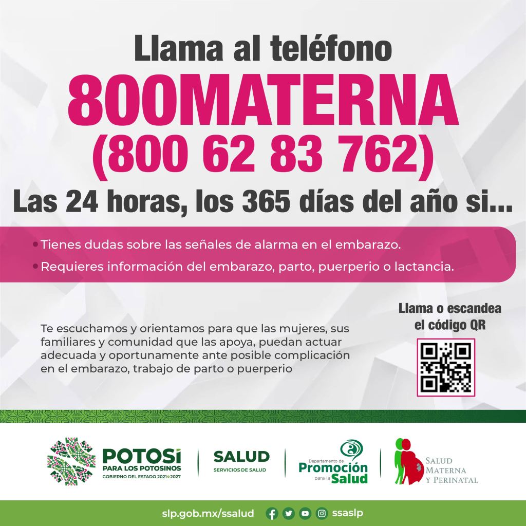 En caso de emergencias durante el embarazo marca al (800 MATERNA), servicio las 24 horas.