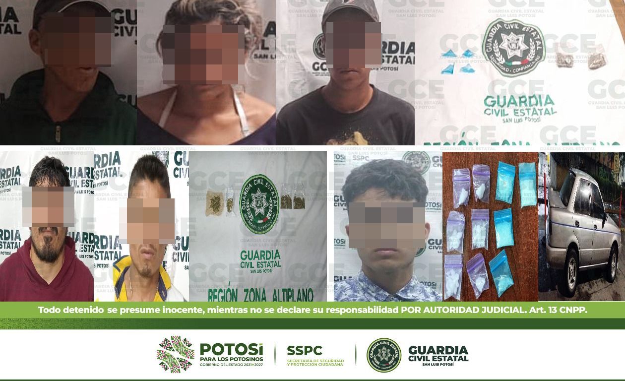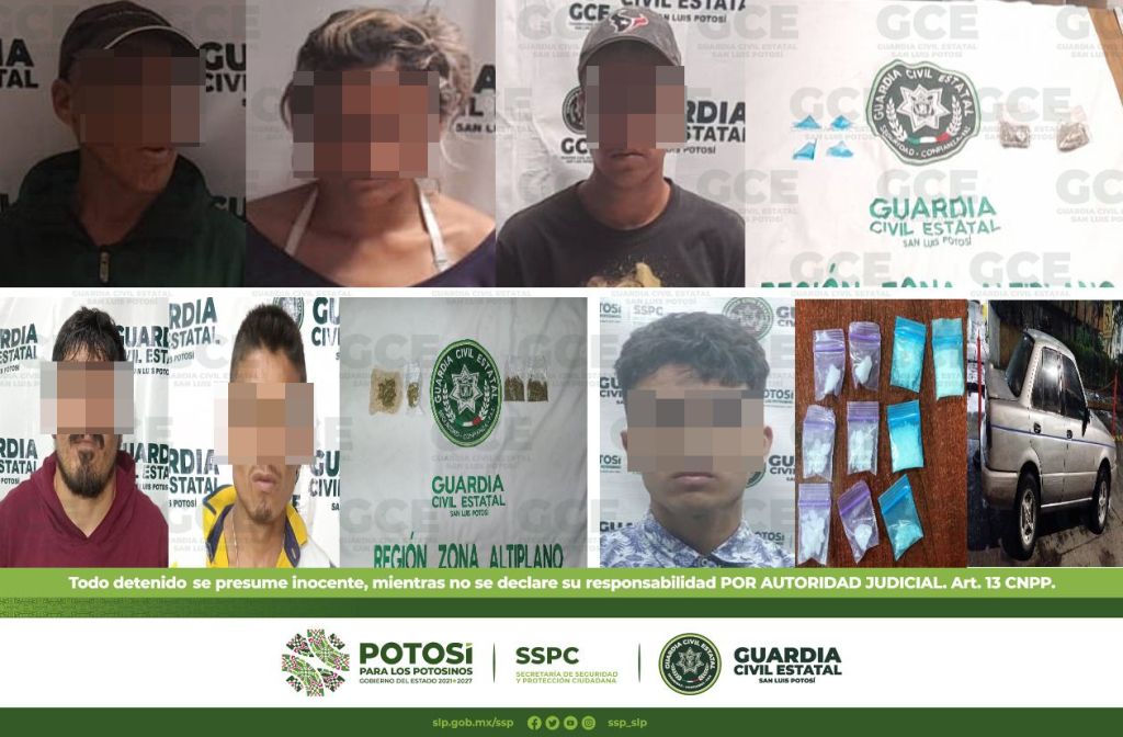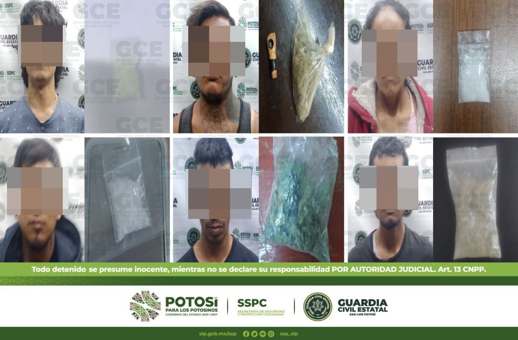 Durante los operativos en la capital potosina, oficiales de la GCE detuvieron a 12 personas mediante los recorridos de seguridad: en la zona centro, Carlos de 28 años de edad fue sorprendido con una bolsa que tenía marihuana; en Ciudad Satélite, a Edgar de 23 años se le aseguró una dosis de “cristal” y una motocicleta en la que se desplazaba; a su vez en la colonia Bellas Lomas, a José de 19 años se le sorprendió con 10 dosis de “cristal” y un automotor Nissan en el que se desplazaba; otro de los hechos fue en la colonia Guanos, donde Alma de 42 años y Hugo de 27 años fueron detenidos con cuatro bolsas que tenían marihuana.