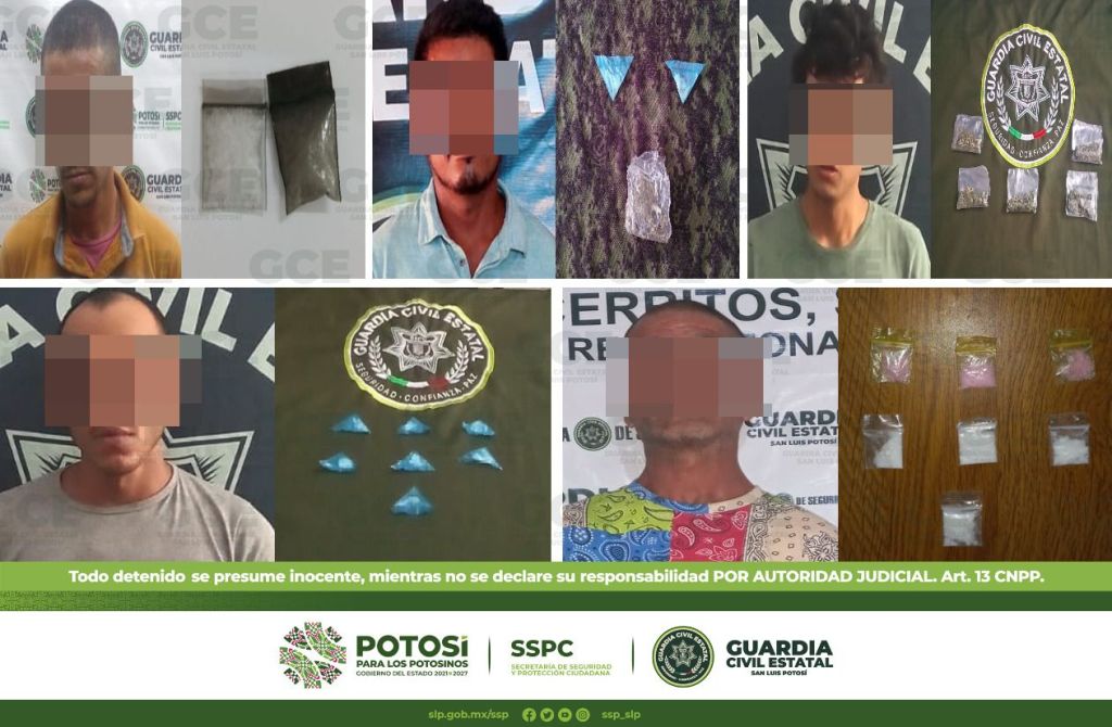 A través de los patrullajes de vigilancia emitidos en el municipio de Soledad de Graciano Sánchez, resultó detenido José de 46 años de edad en la colonia Rancho Blanco, después de que agentes de la GCE le aseguraran tres dosis de “cristal”. En el municipio de El Naranjo, oficiales estatales aprehendieron a Jovanny de 31 años con dos dosis de “cristal” y una bolsa con marihuana; igualmente, en la misma zona, a Isaí de 32 años después de asegurarle 7 dosis de “cristal»; en el municipio de Ciudad Valles, fue identificado Juan de 20 años con cinco bolsas que tenían marihuana.