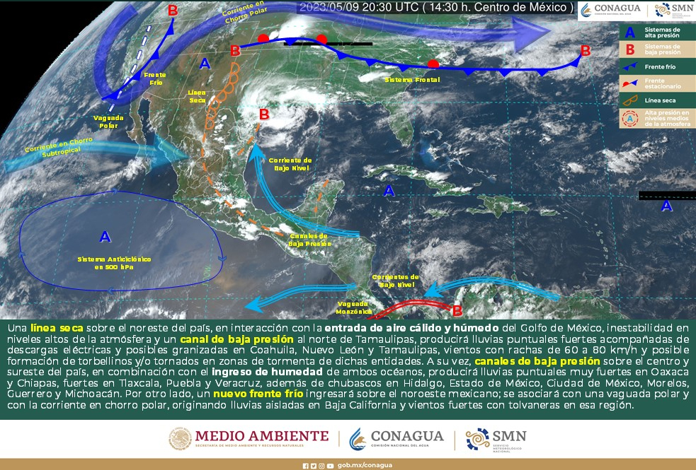 Viento con rachas de 70 a 90 km/h y tolvaneras: Baja California, Sonora y Chihuahua, y con posible formación de torbellinos o tornados: Coahuila, Nuevo León y Tamaulipas.