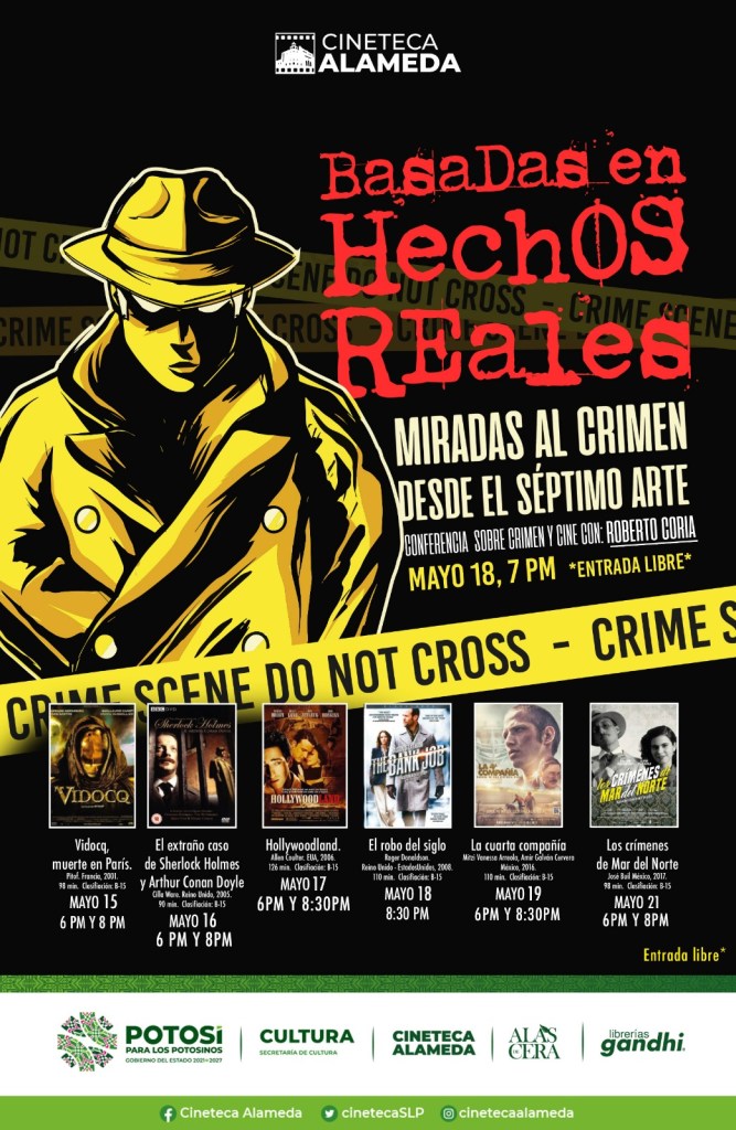La Secretaría de Cultura de San Luis Potosí, invita al público en general a participar en la conferencia “Miradas al crimen desde el 7º arte” que impartirá el escritor Roberto Coria el próximo jueves 18 de mayo a las 19:00 horas, en Cineteca Alameda, entrada libre.