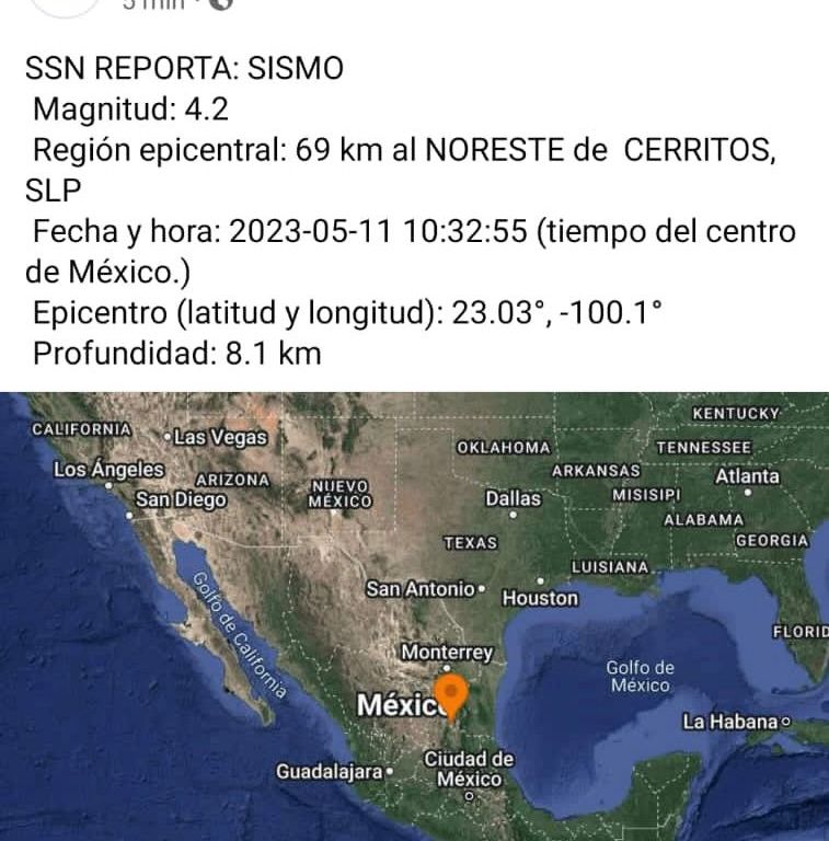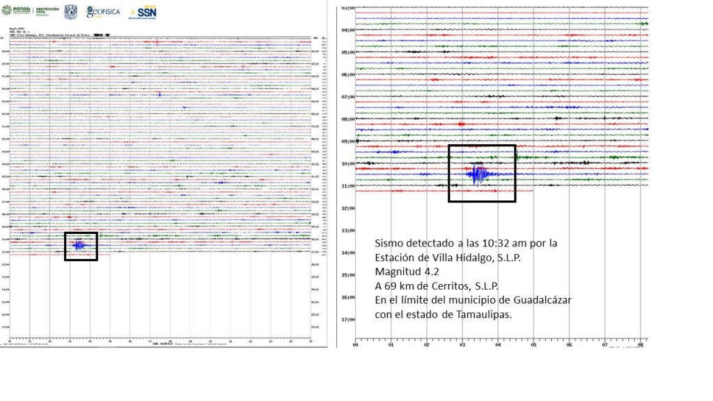 La Coordinación Estatal de Protección Civil (CEPC), informó que este jueves, el sismógrafo ubicado en Villa Hidalgo, detectó un movimiento telúrico de 4.2 grados en la escala de Richter, con epicentro en el municipio de Guadalcázar en los límites con Tamaulipas, sin que se reporten afectaciones; sin embargo, se mantiene atenta con las autoridades municipales en caso de que la población llegara a reportar algún agrietamiento en inmuebles.