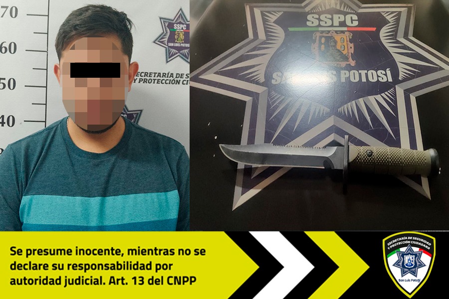 El sujeto tomó una actitud agresiva y ponía resistencia al aseguramiento, en ese momento se le realizó una revisión preventiva de seguridad y se le detectó un cuchillo fajado a la cintura, el cual tenía una hoja de metal de 17 centímetros y una empuñadura de 12 centímetros.