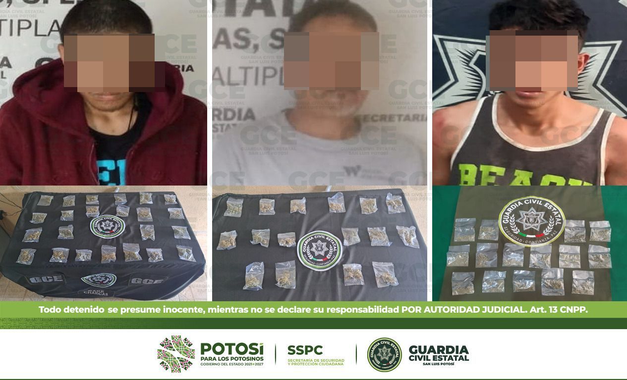 A un año de resultados por parte de las acciones de la Guardia Civil Estatal, en las últimas horas se detuvo a tres presuntos narcomenudistas, dos de ellos en el municipio de Moctezuma y uno más en Ciudad Valles; tras la incursión de las fuerzas del orden público se aseguraron más de 50 dosis de enervantes.