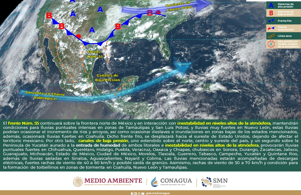 Viento con rachas de 40 a 60 km/h y posibles tolvaneras: Baja California, Baja California Sur, Sonora, Chihuahua, Coahuila, Nuevo León, Tamaulipas, Durango, Zacatecas, San Luis Potosí, Aguascalientes y Jalisco.
