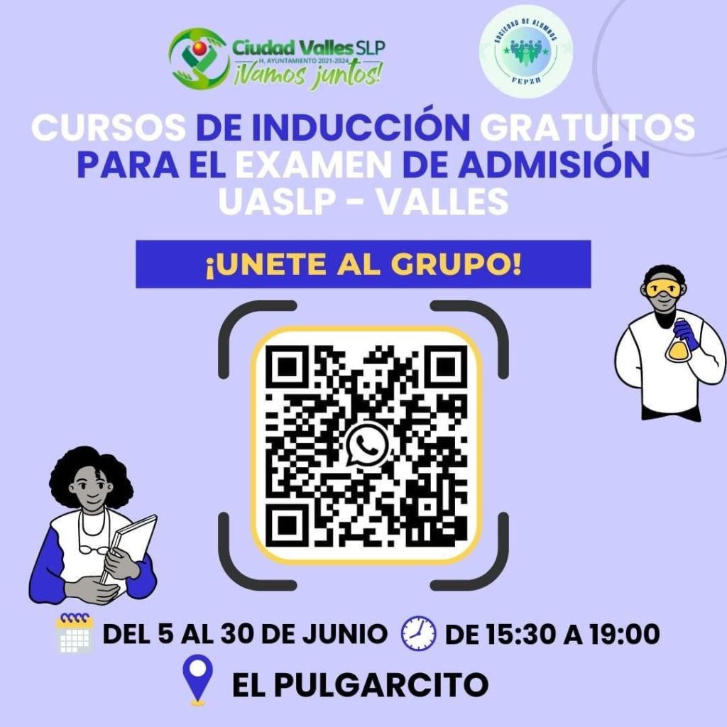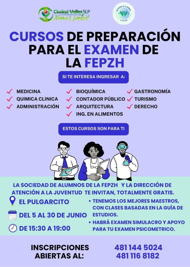 La Dirección de Atención a la Juventud del Ayuntamiento de Ciudad Valles, invita a los aspirantes a ingresar a la Facultad de Estudios Profesionales Zona Huasteca, a recibir los cursos de inducción gratuitos para el examen de admisión, que son organizados por la Sociedad de Alumnos de dicha casa de estudios.