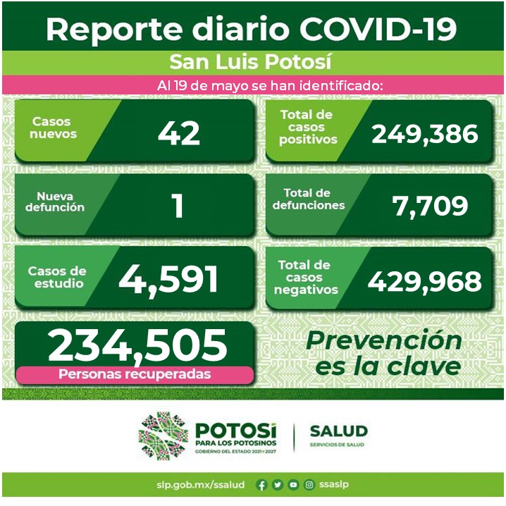 Se suma una defunción por Covid-19 en este día, por lo que la cifra de muertes en el Estado aumenta a 7 mil 709. Este deceso corresponde a una mujer de 60 años de edad que contaba con esquema de vacunación completo contra el virus; sin embargo, como factores de riesgo presentaba enfermedad pulmonar y tabaquismo.
