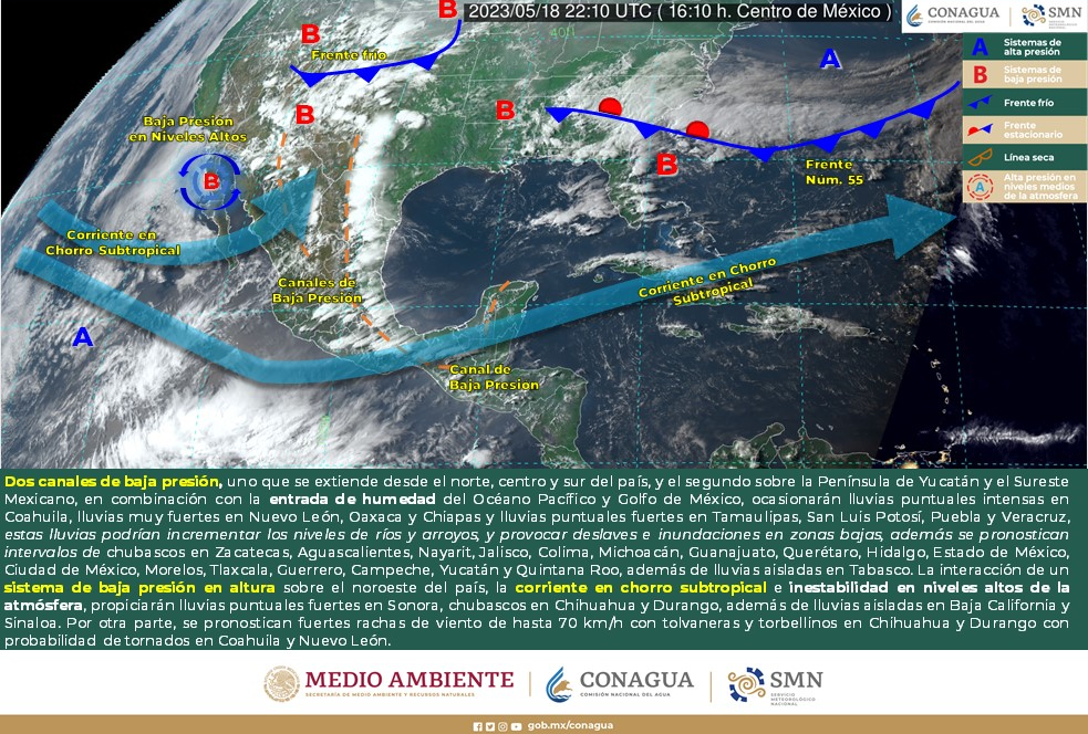 Viento con rachas de 40 a 60 km/h y posibles tolvaneras: Baja California, Baja California Sur, Sonora, Sinaloa, Zacatecas, Aguascalientes, San Luis Potosí, Nayarit, Jalisco, Michoacán, Guanajuato, Querétaro, Guerrero, Oaxaca y Chiapas.