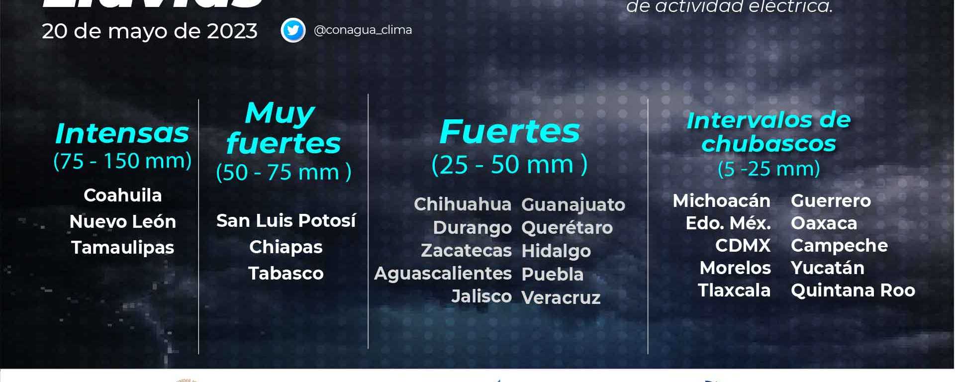 También previó lluvias “fuertes” en Aguascalientes, Chihuahua, Durango, Guanajuato, Hidalgo, Jalisco, Puebla, Querétaro, Veracruz y Zacatecas.